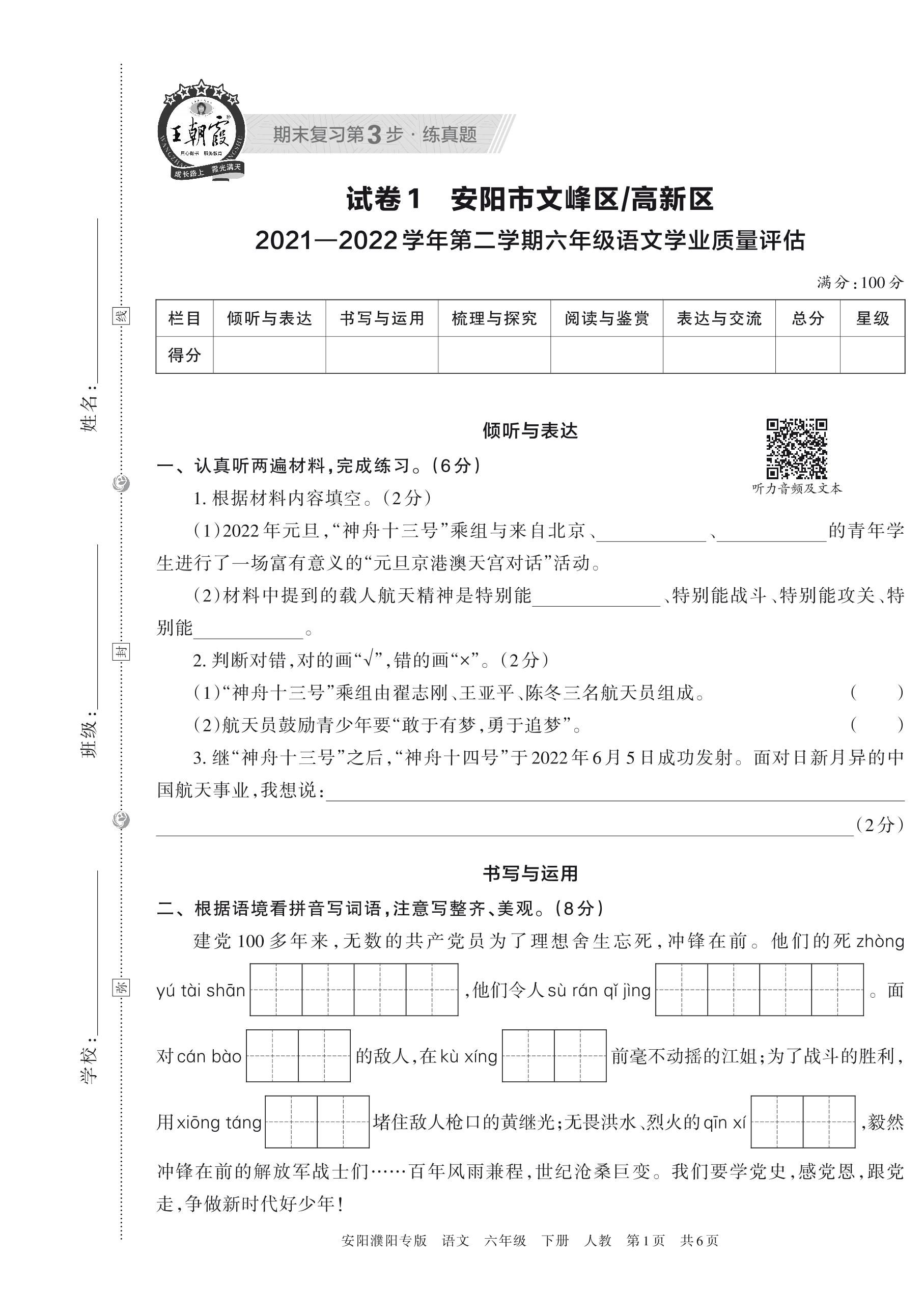 安阳市文峰区、高新区2021—2022学年第二学期六年级语文学业质量评估(人教版)【1】