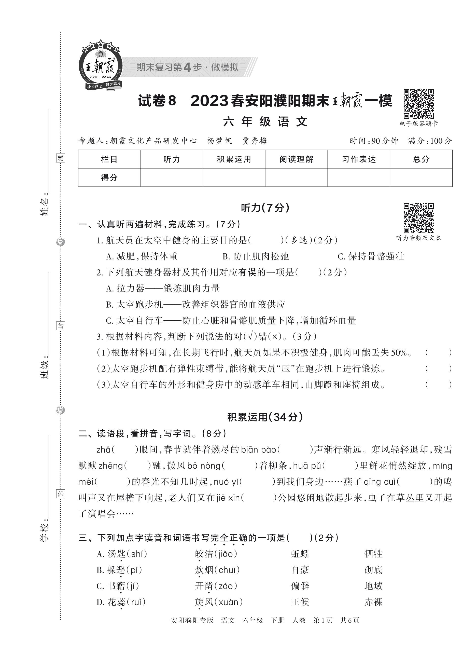 王朝霞期末模拟卷六年级下册语文(人教版)_R230504135122546【8】