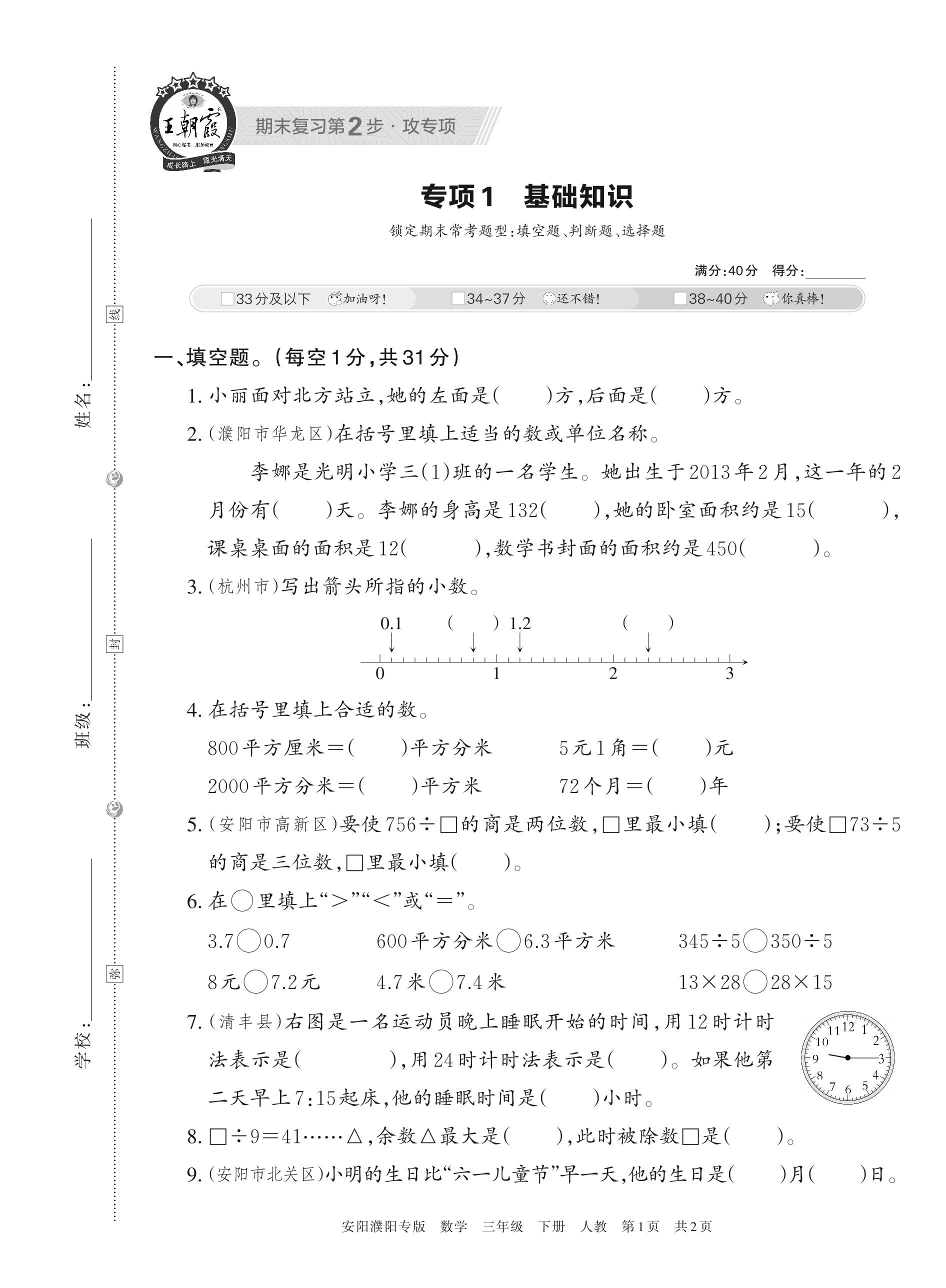 王朝霞期末专项卷——基础知识三年级下册数学(人教版)_R230504135742686【1】