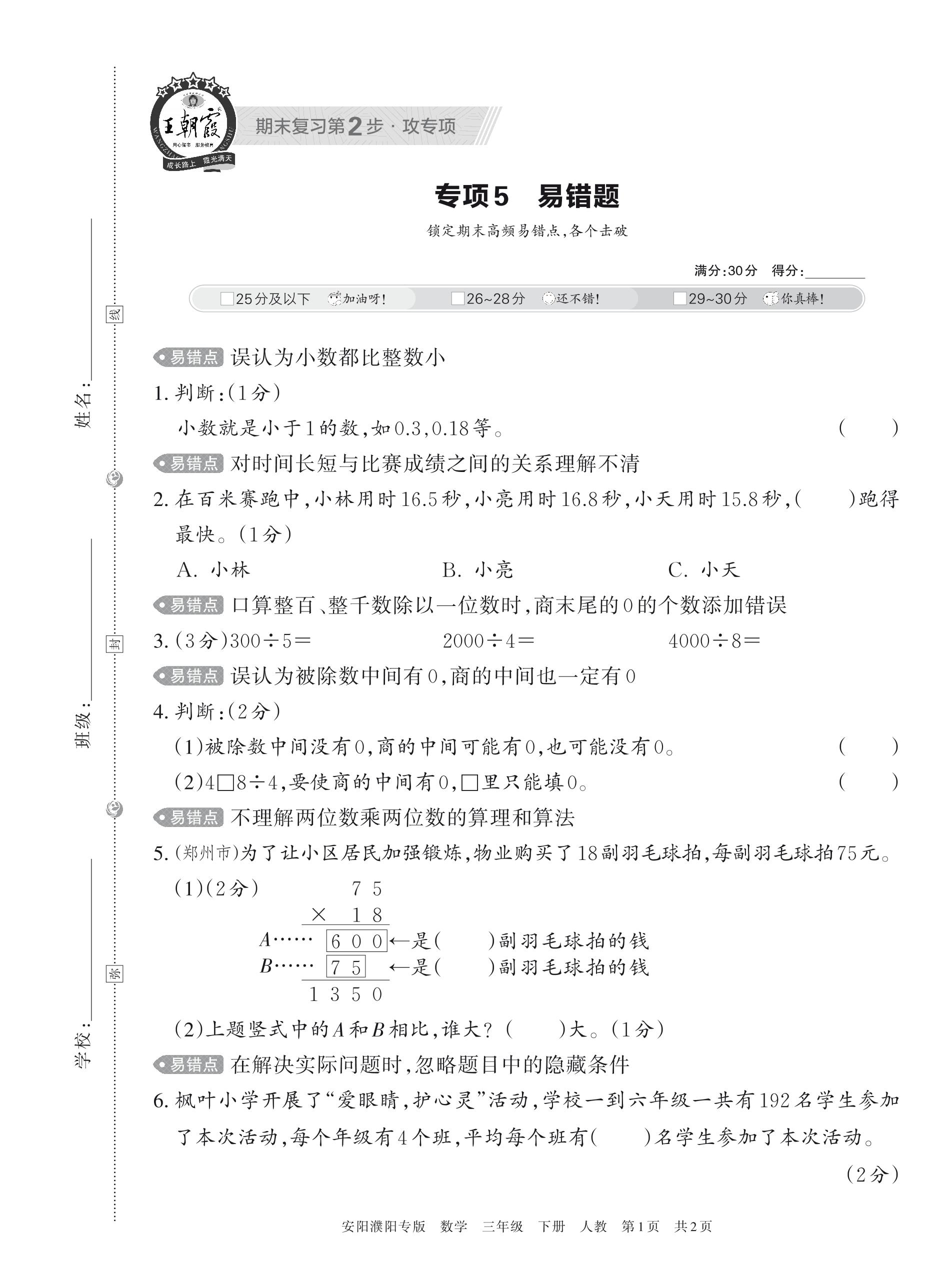王朝霞期末专项卷——易错题三年级下册数学(人教版)_R230504135742688【5】