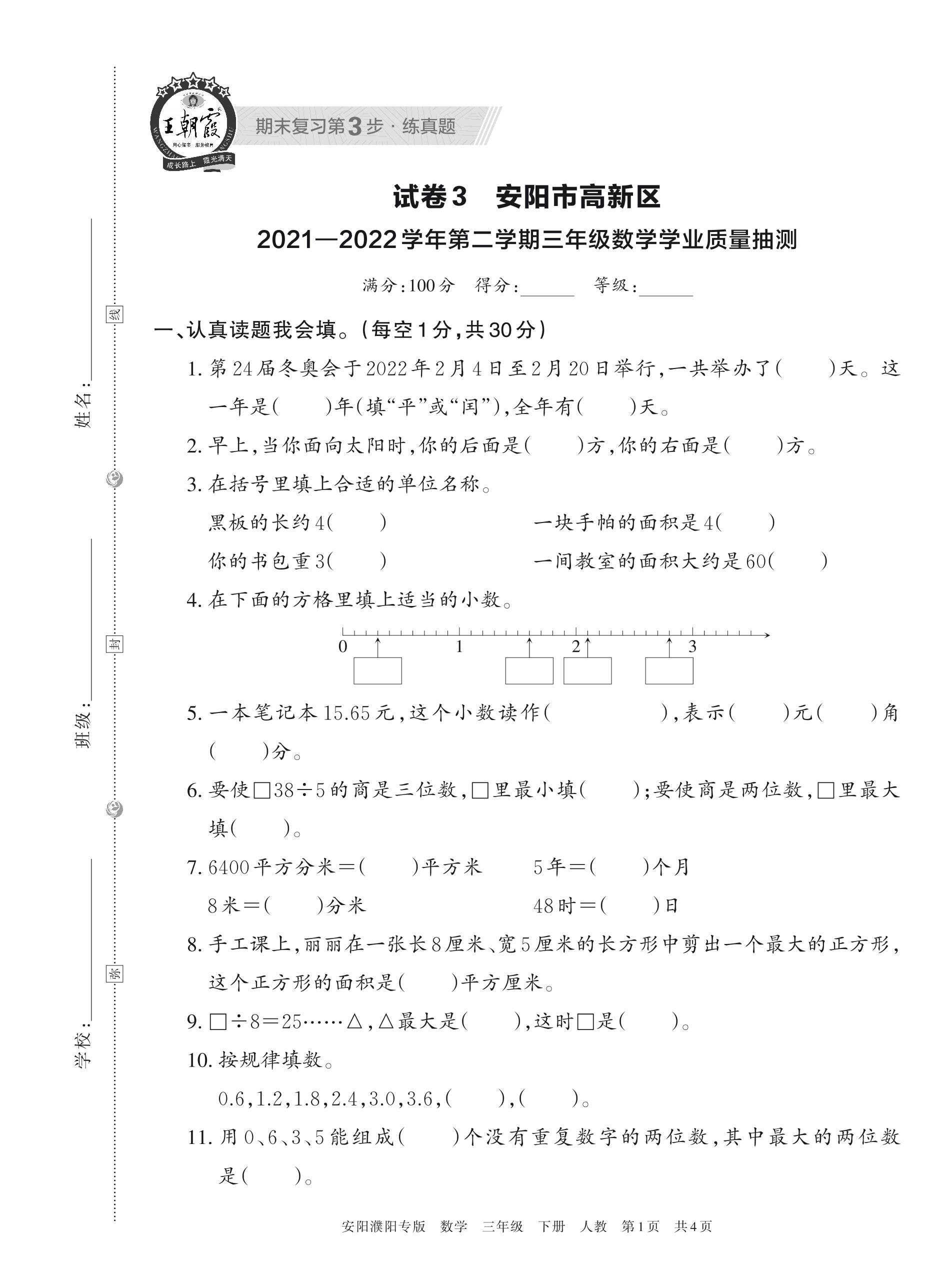 安阳市高新区2021—2022学年第二学期三年级数学学业质量抽测(人教版)【3】