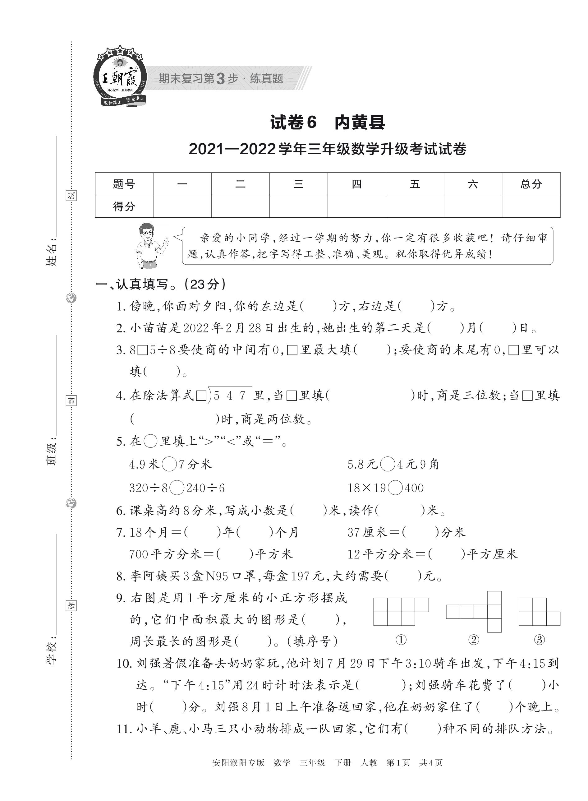 内黄县2021—2022学年三年级数学升级考试试卷(人教版)【6】