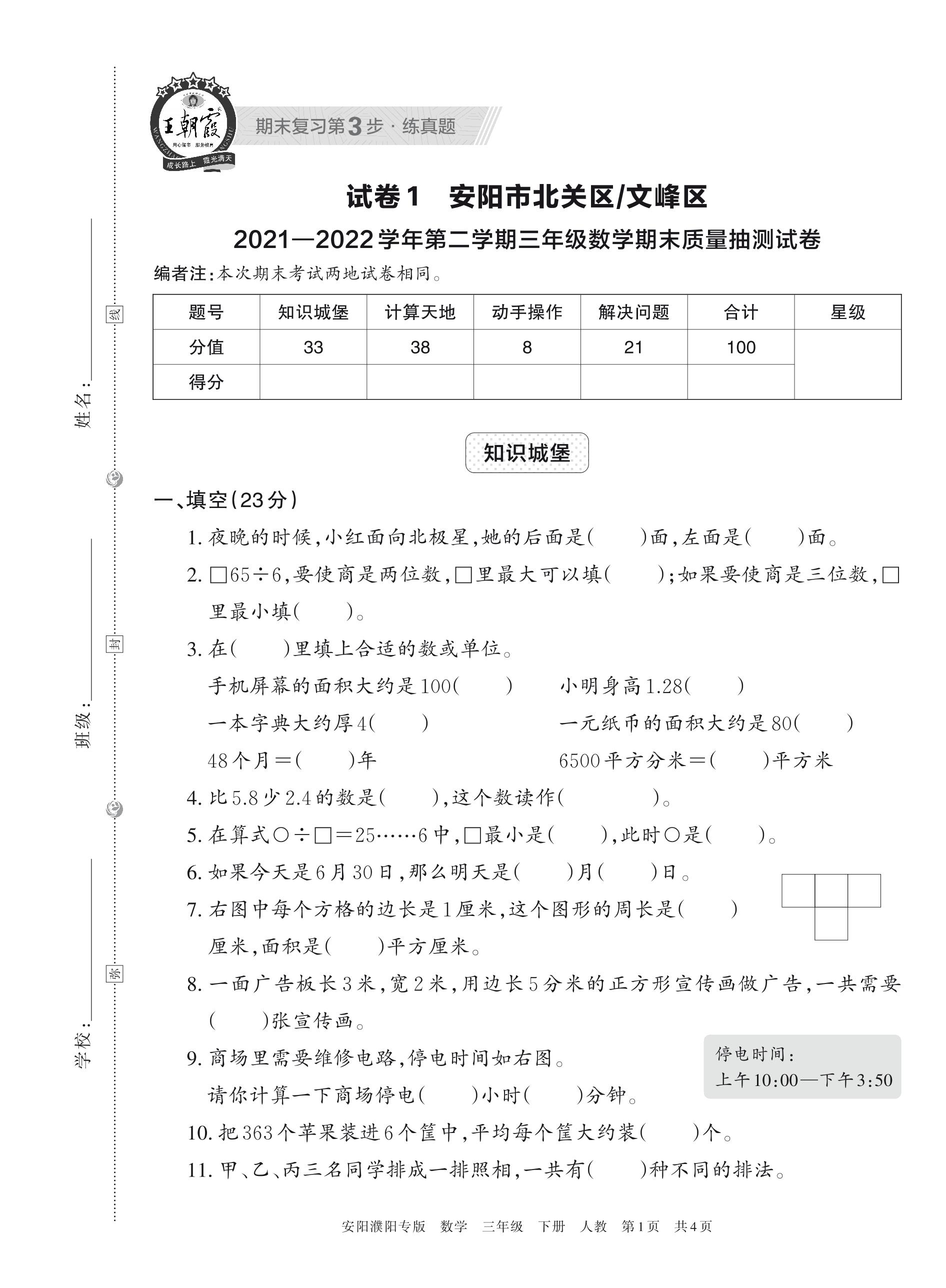 安阳市北关区、文峰区2021—2022学年第二学期三年级数学期末质量抽测试卷(人教版)【1】