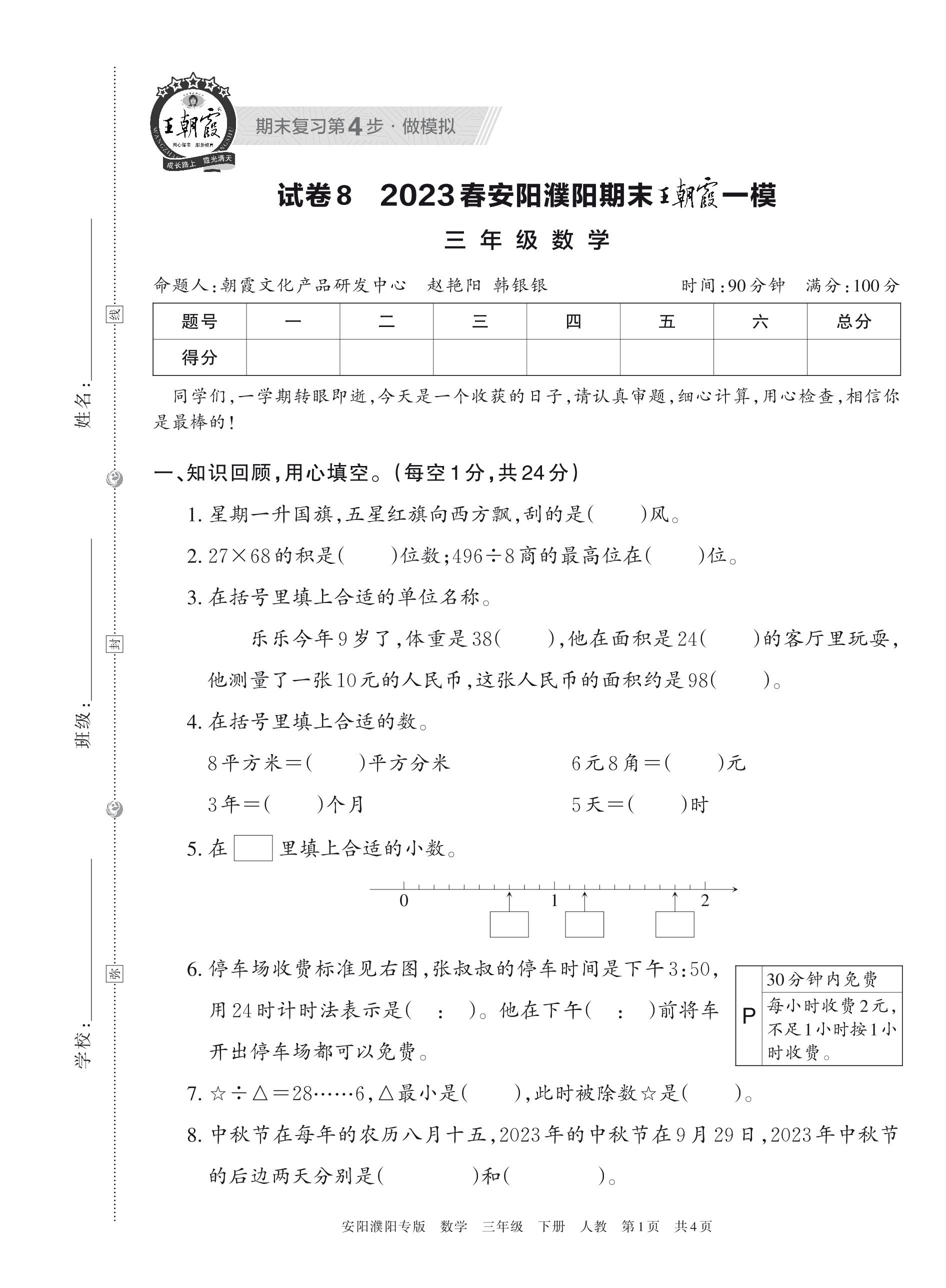 王朝霞期末模拟卷三年级下册数学(人教版)_R230504135744904【8】