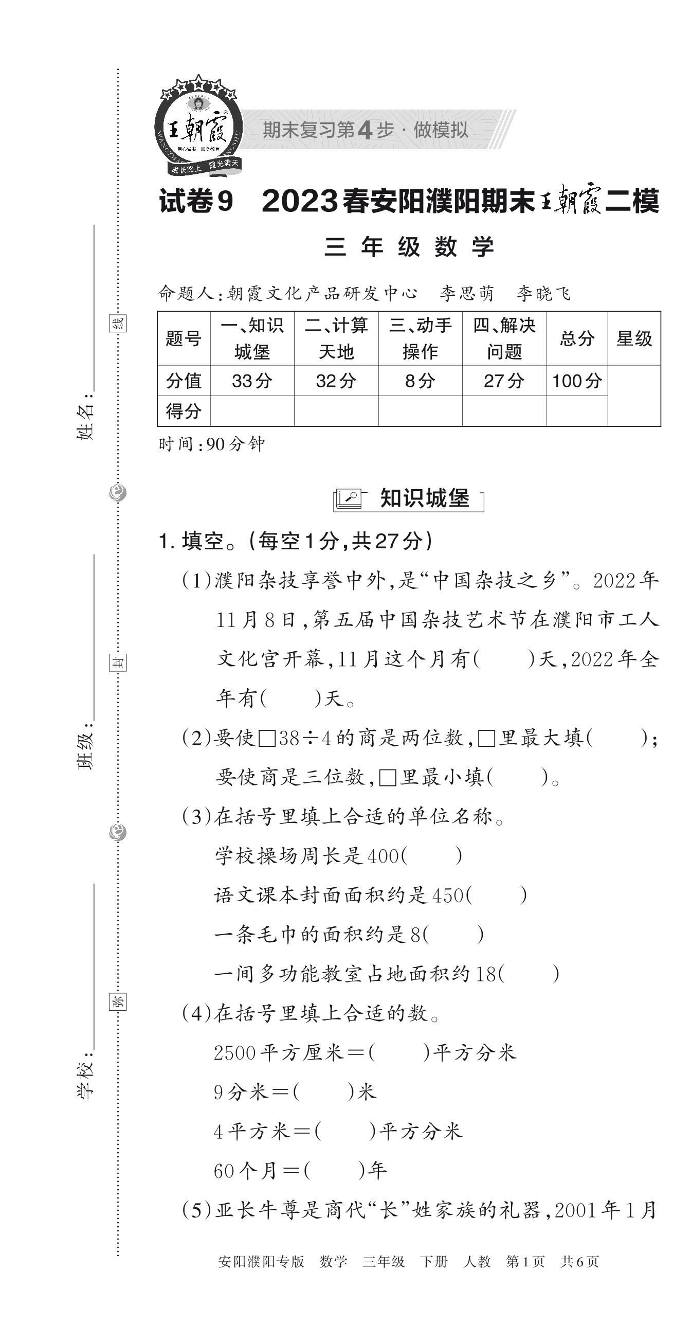 王朝霞期末模拟卷三年级下册数学(人教版)_R230504135744455【9】