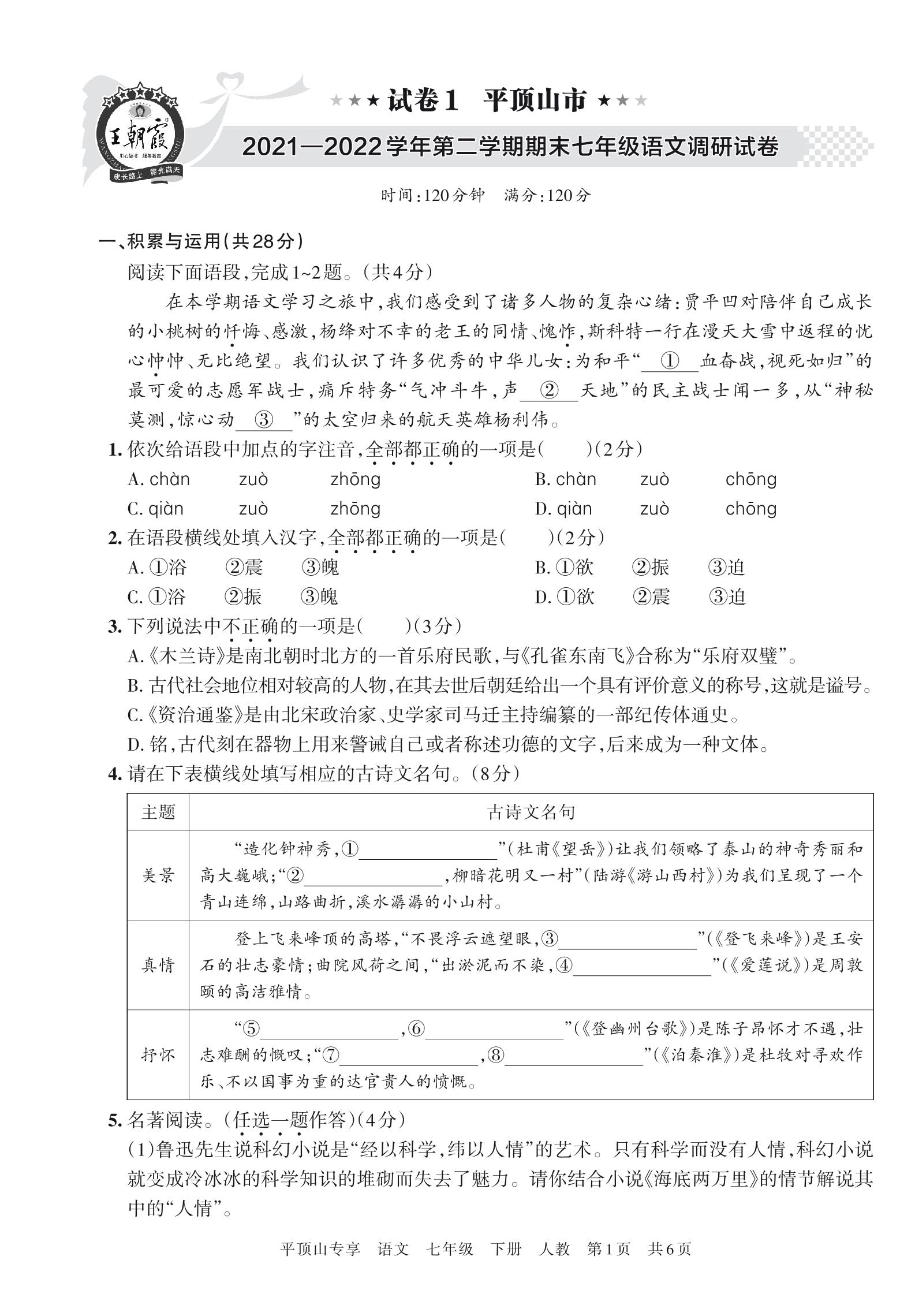 平顶山市2021—2022学年第二学期期末七年级语文调研试卷(人教版)【1】