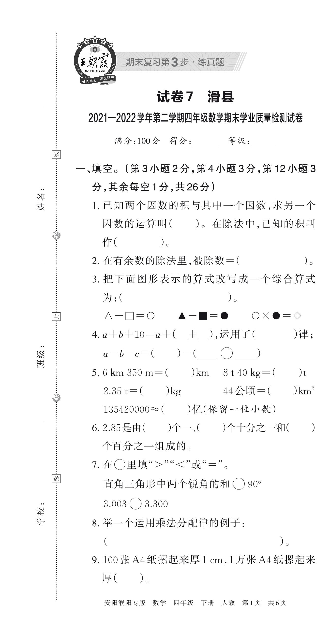 滑县2021—2022学年第二学期四年级数学期末学业质量检测试卷(人教版)【7】