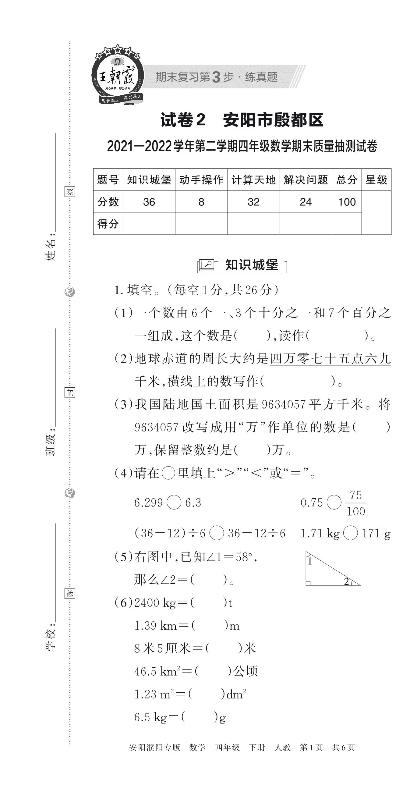安阳市殷都区2021—2022学年第二学期四年级数学期末质量抽测试卷(人教版)【2】