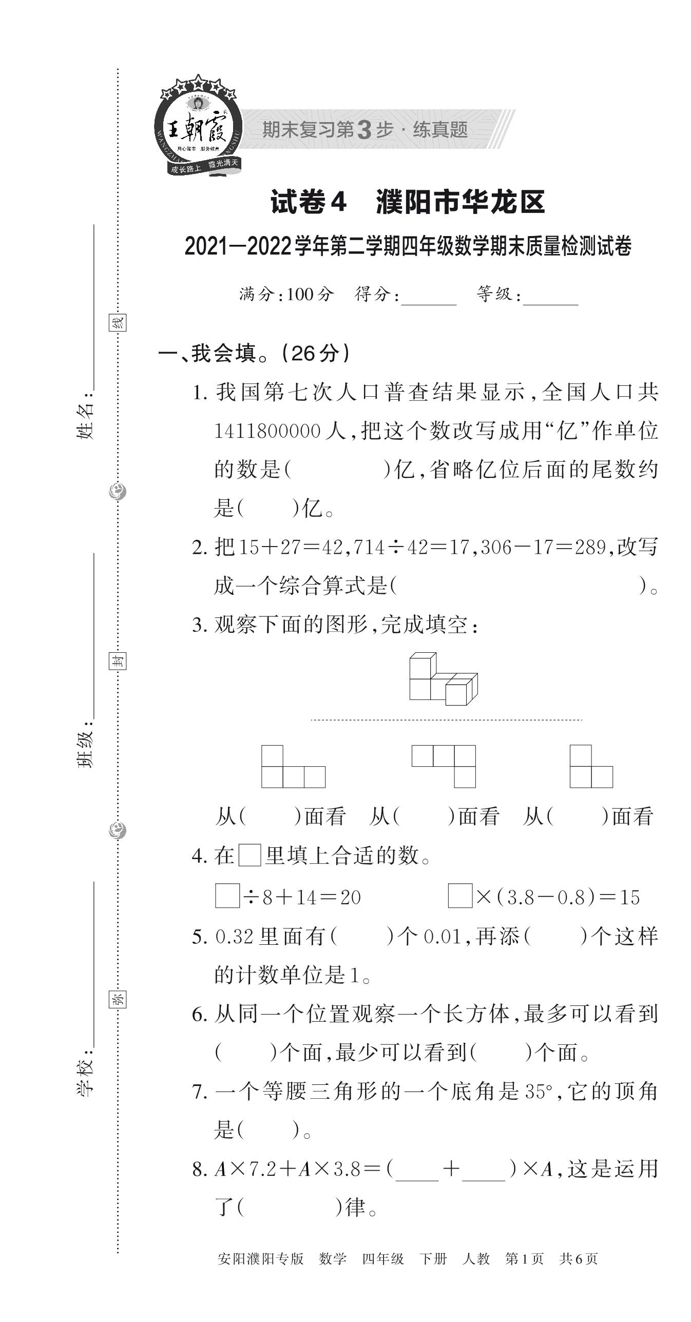濮阳市华龙区2021—2022学年第二学期四年级数学期末质量检测试卷(人教版)【4】