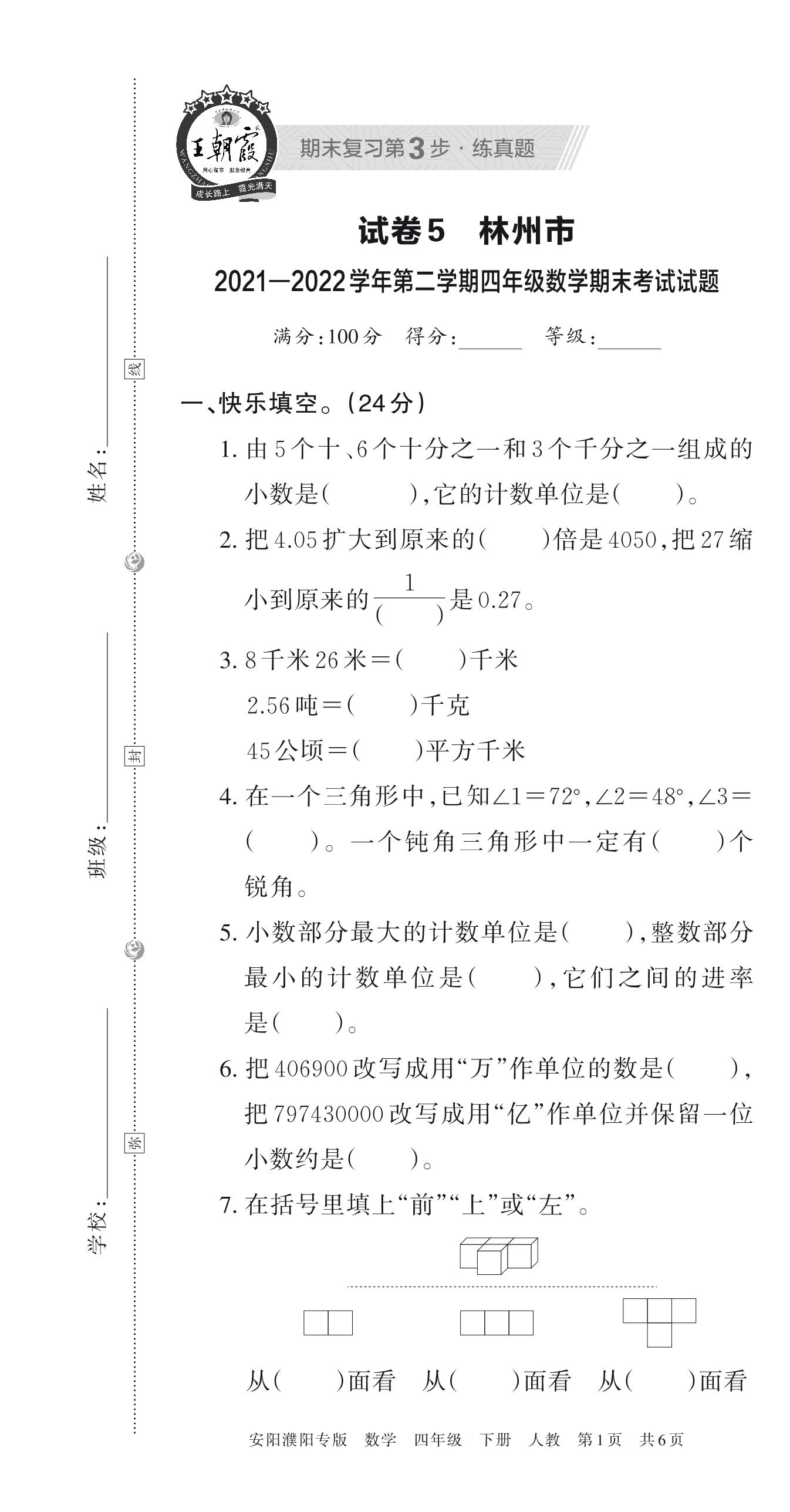 林州市2021—2022学年第二学期四年级数学期末考试试题(人教版)【5】