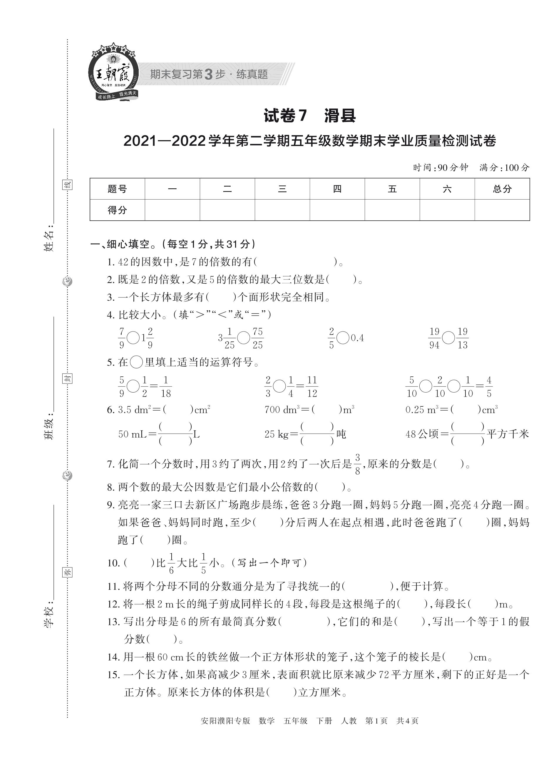 滑县2021—2022学年第二学期五年级数学期末学业质量检测试卷(人教版)【7】