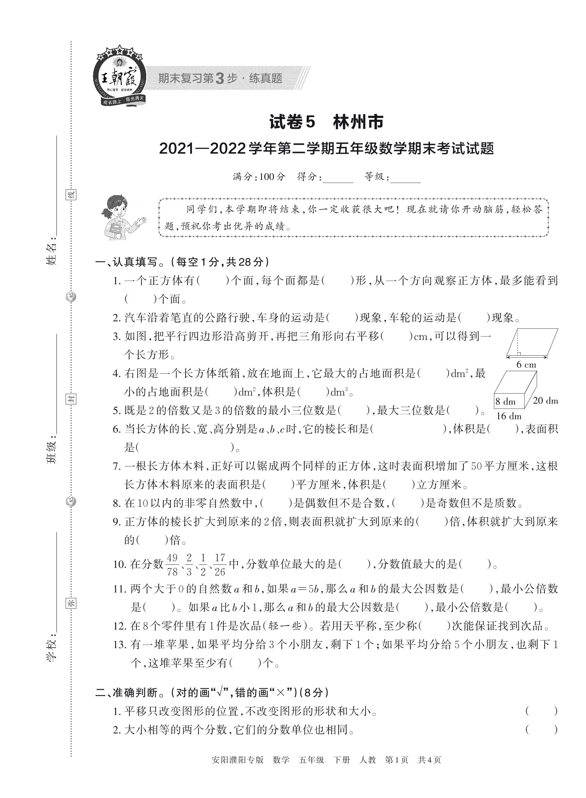 林州市2021—2022学年第二学期五年级数学期末考试试题(人教版)【5】
