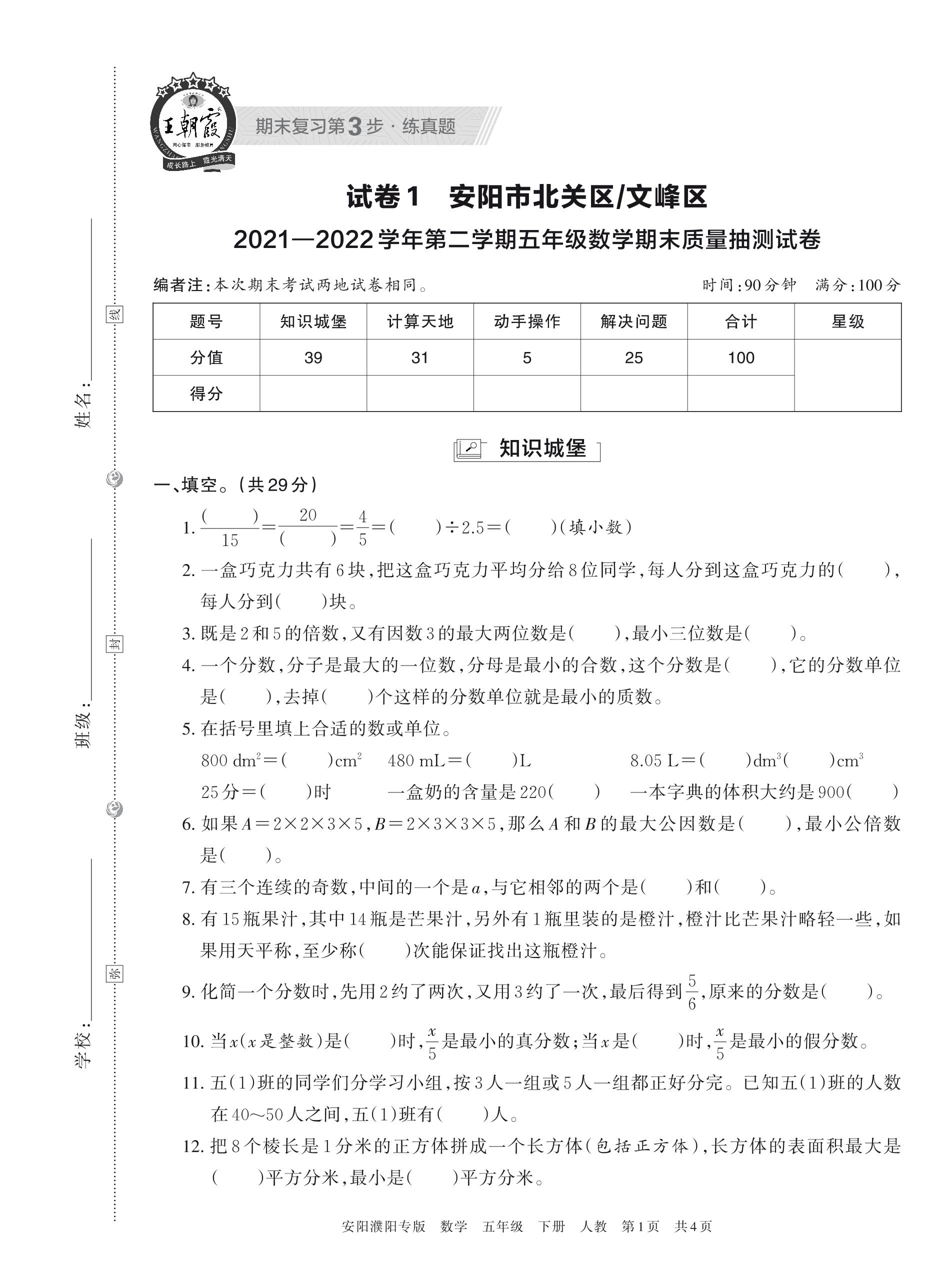 安阳市北关区、文峰区2021—2022学年第二学期五年级数学期末质量抽测试卷(人教版)【1】