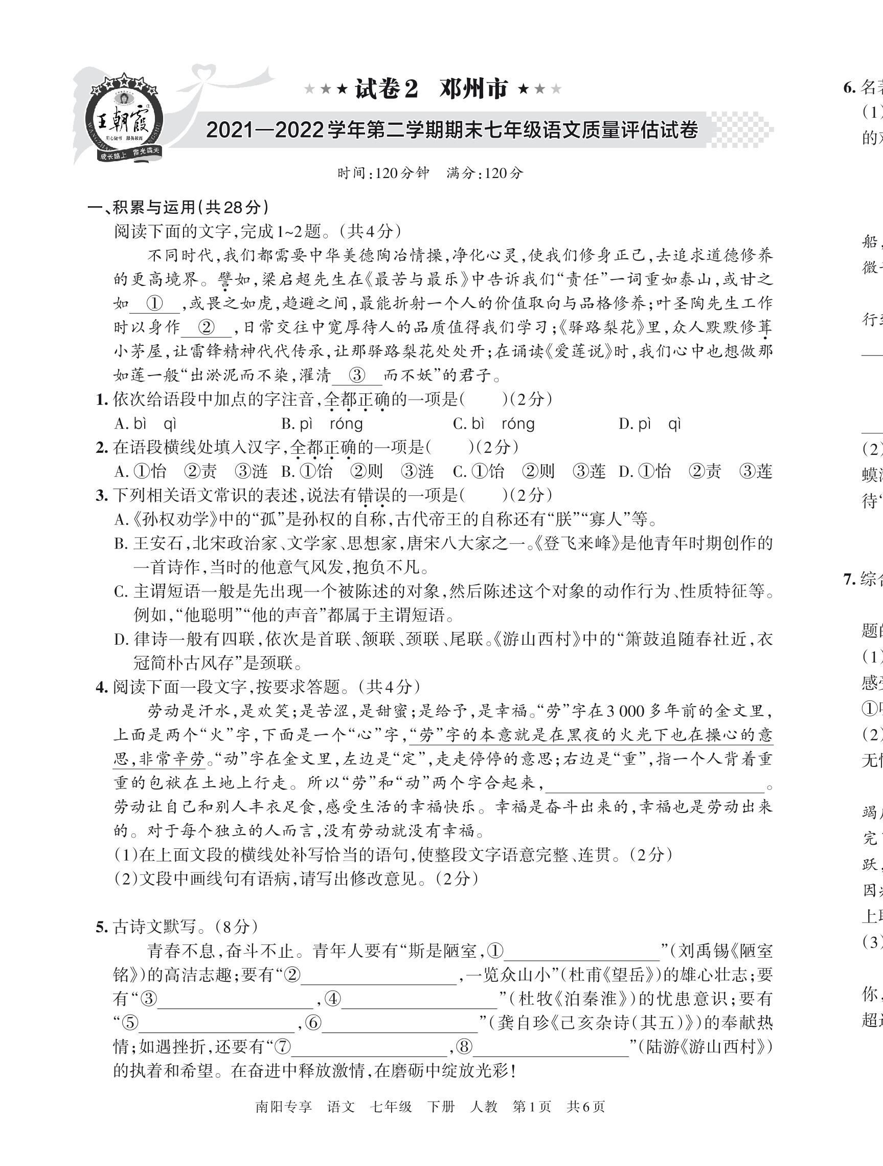 邓州市2021—2022学年第二学期期末七年级语文质量评估试卷(人教版)【2】