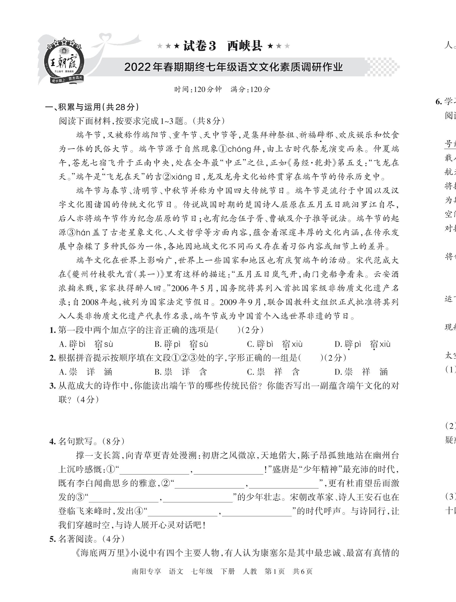 西峡县2022年春期期终七年级语文文化素质调研作业(人教版)【3】