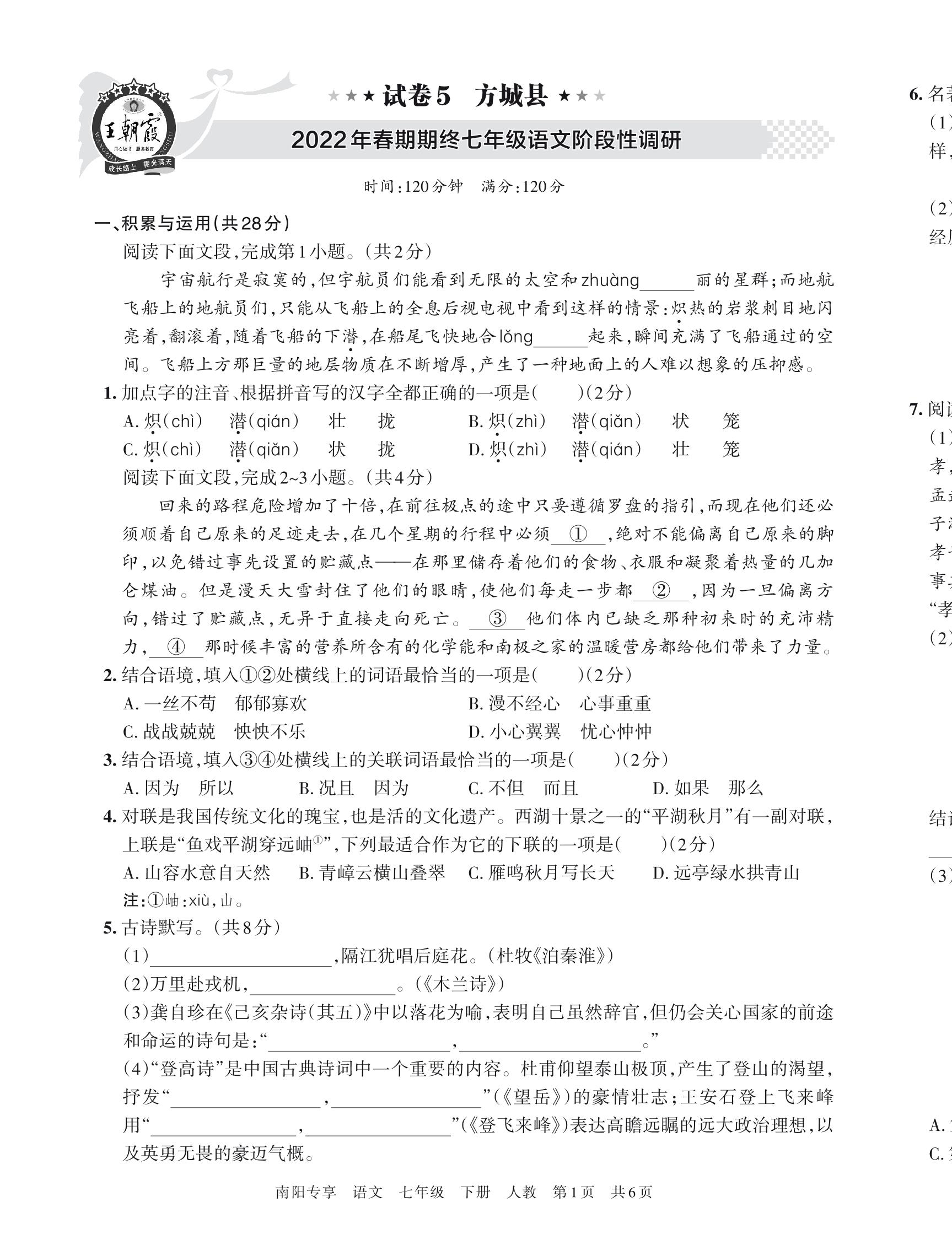 方城县2022年春期期终七年级语文阶段性调研(人教版)【5】