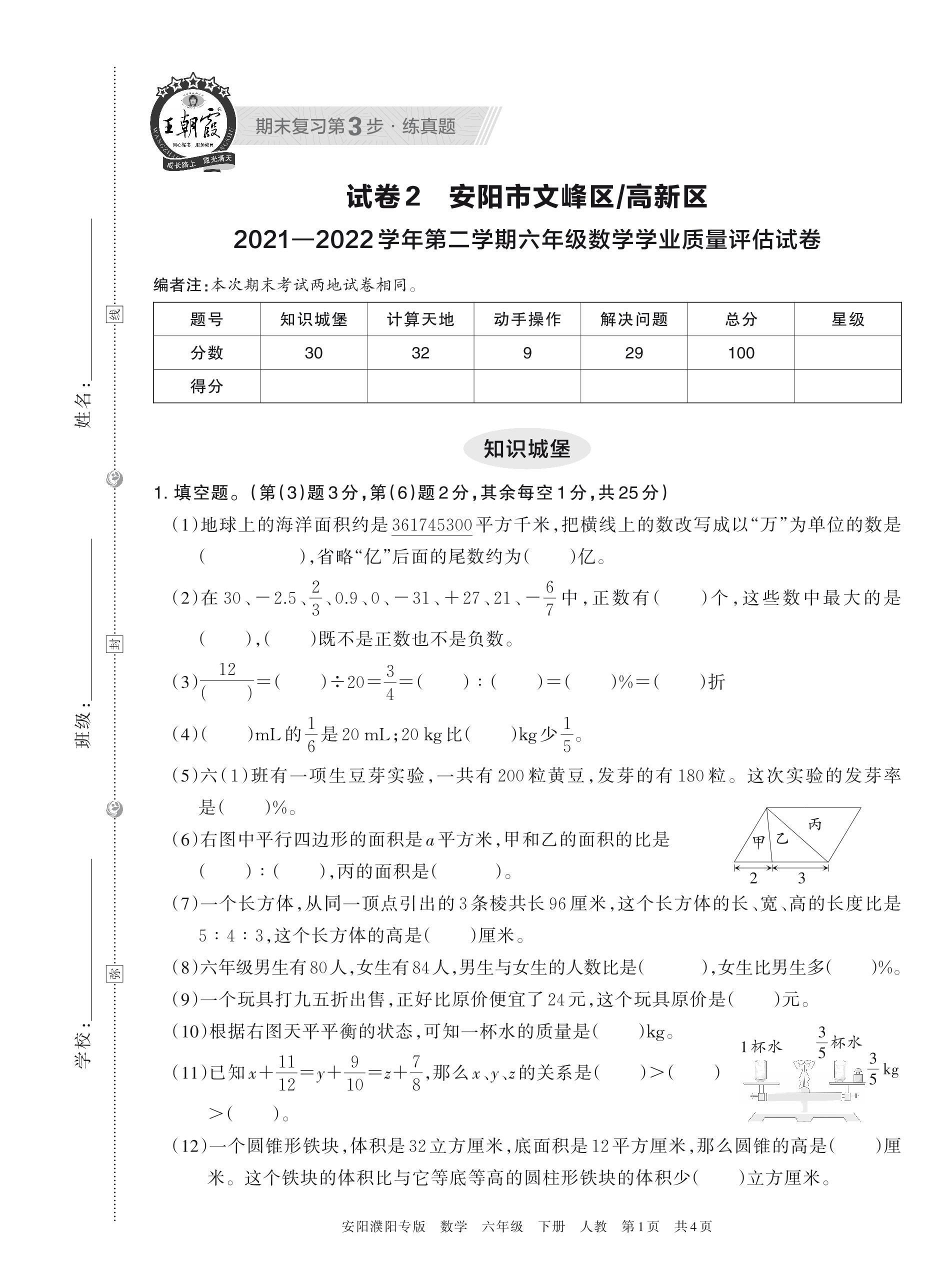 安阳市文峰区、高新区2021—2022学年第二学期六年级数学学业质量评估试卷(人教版)【2】