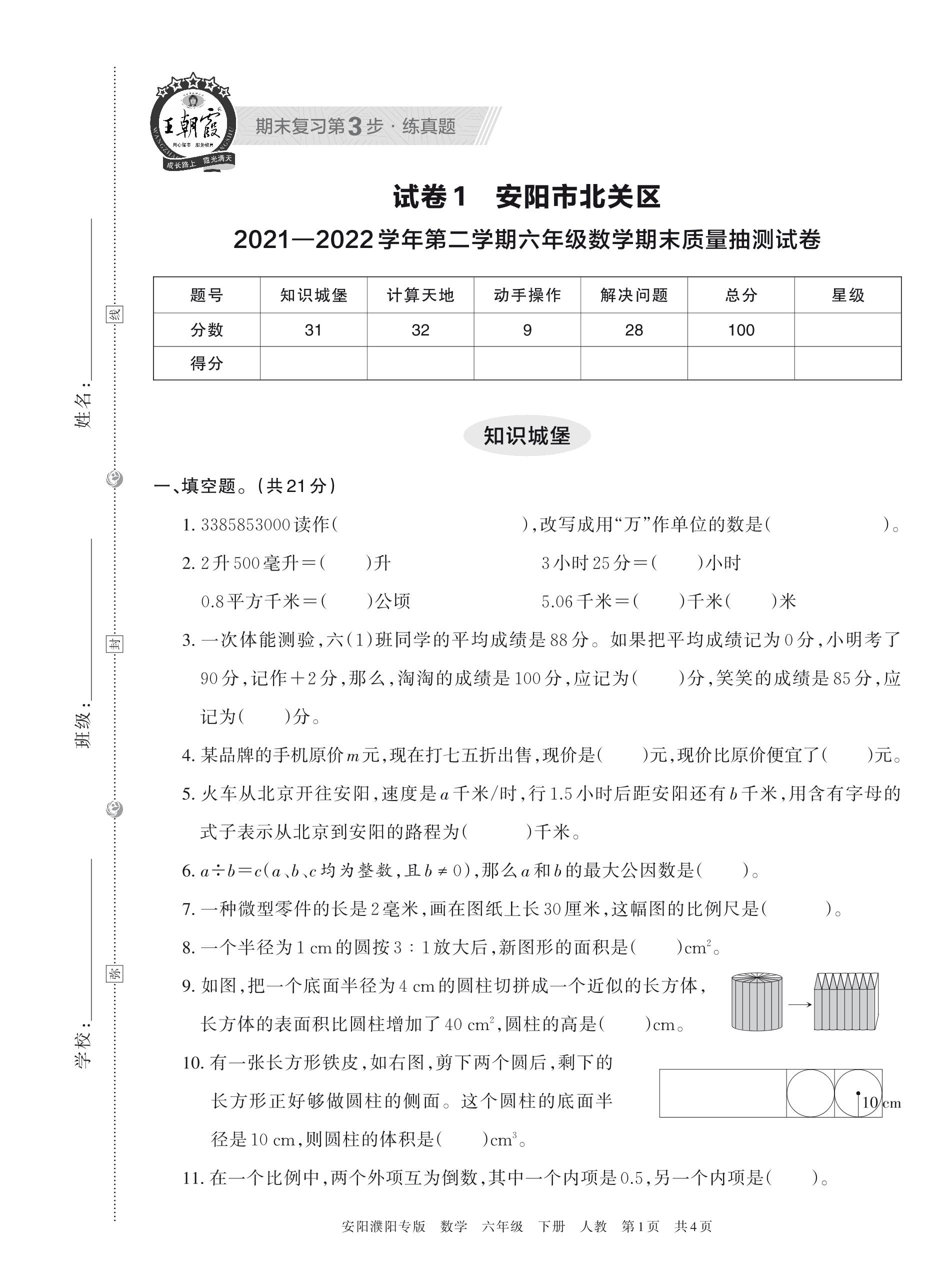 安阳市北关区2021—2022学年第二学期六年级数学期末质量抽测试卷(人教版)【1】