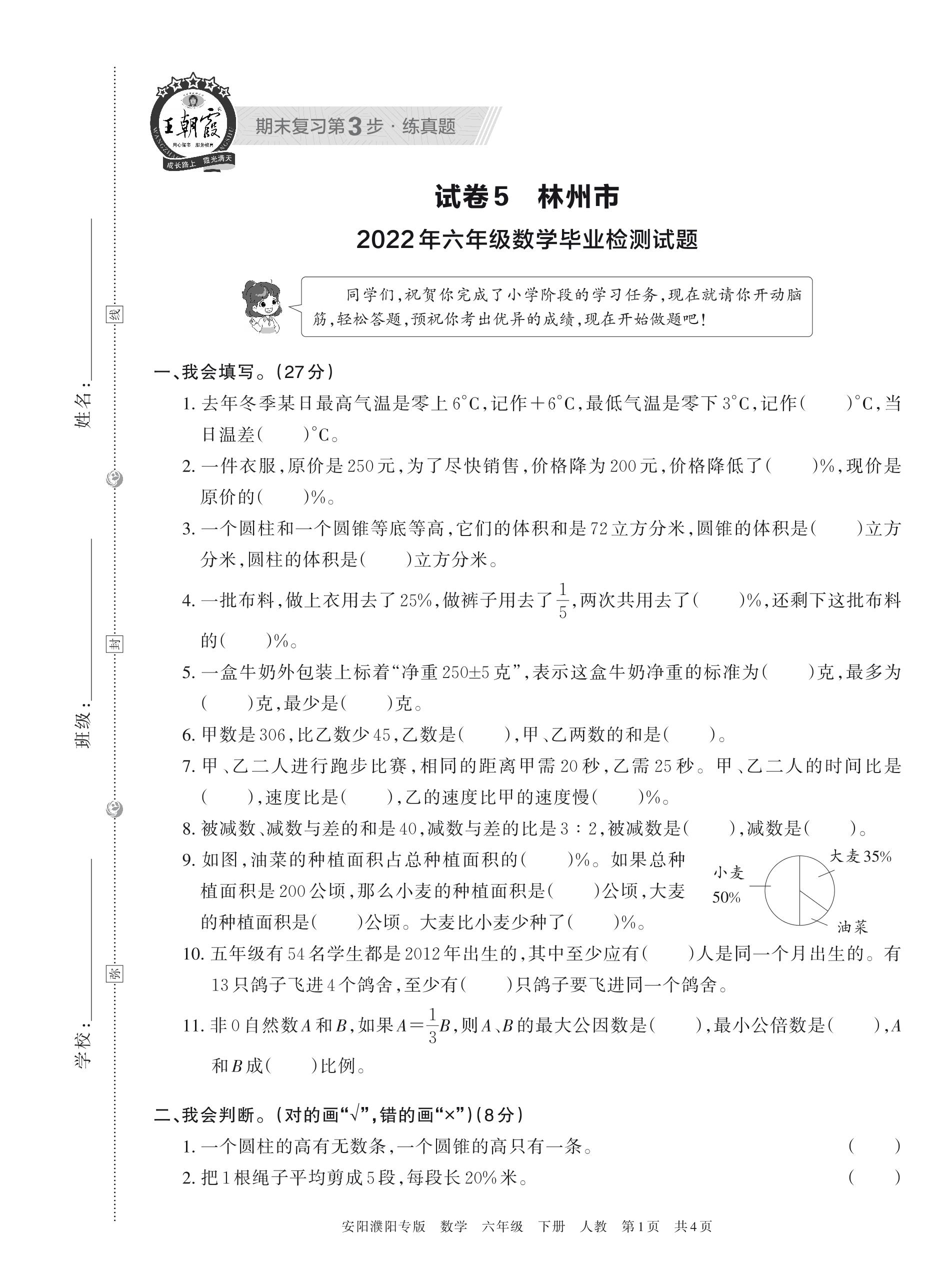林州市2022年六年级数学毕业检测试题(人教版)【5】