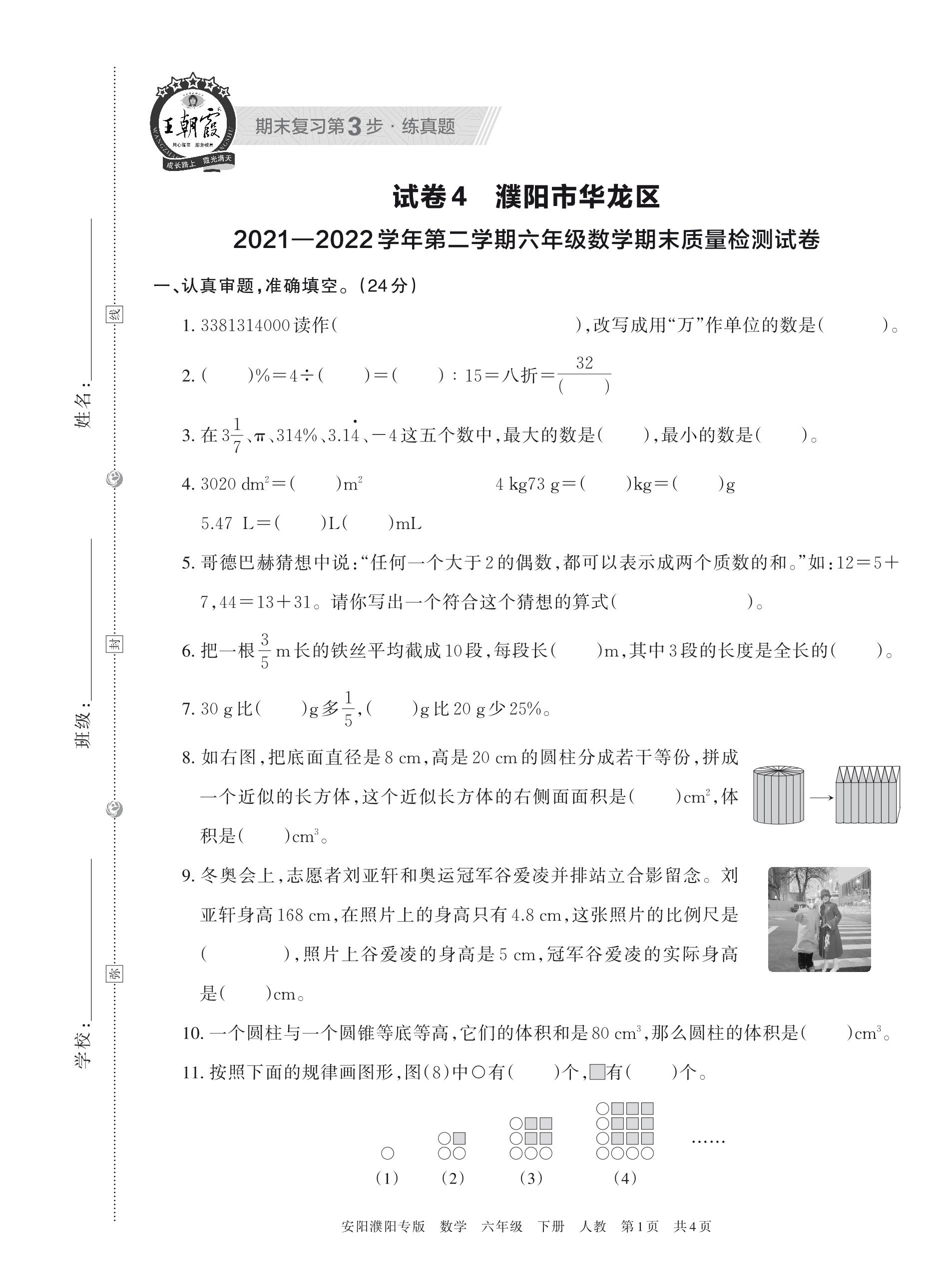 濮阳市华龙区2021—2022学年第二学期六年级数学期末质量检测试卷(人教版)【4】