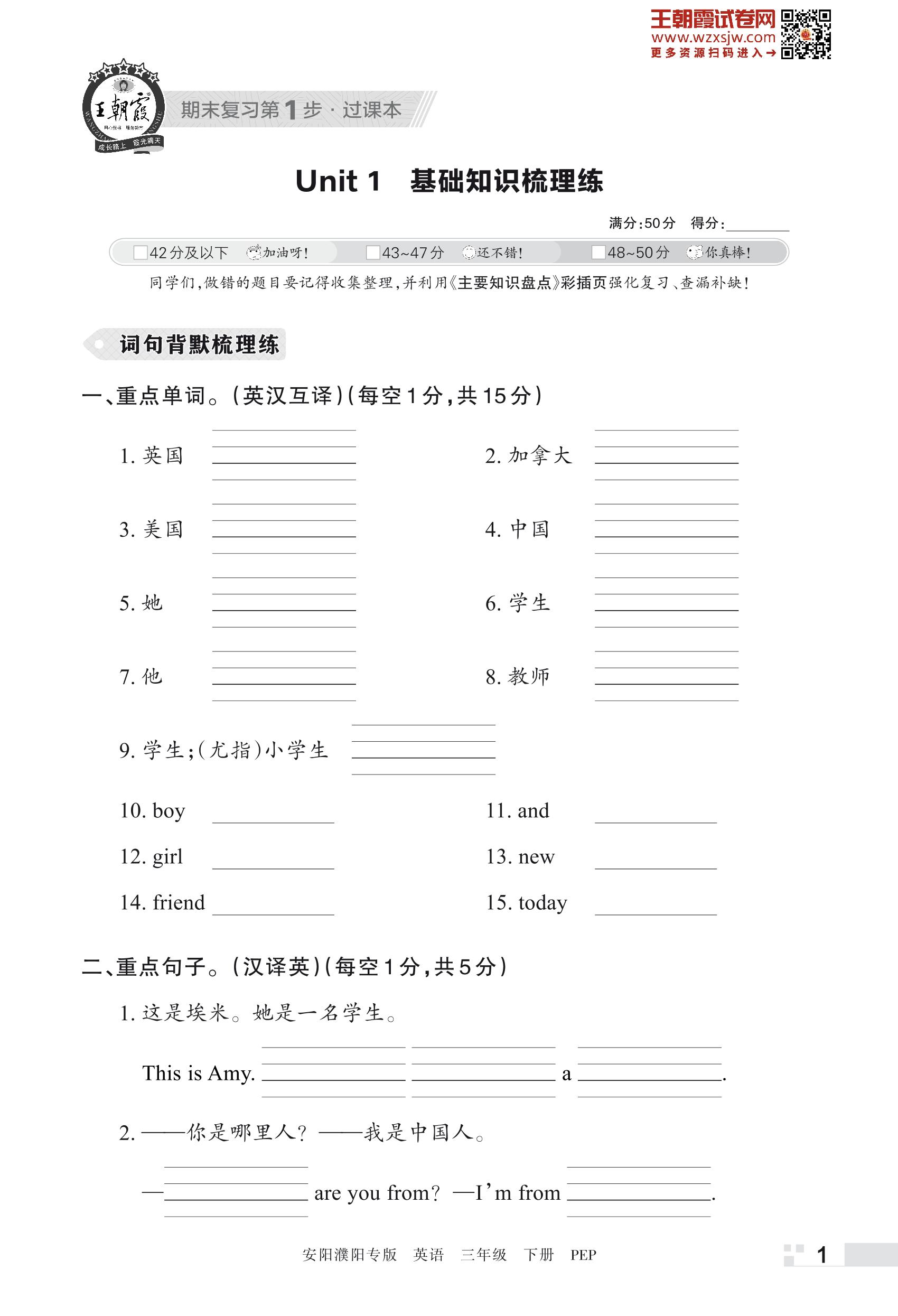 王朝霞期末过课本——Unit 1 基础知识梳理练三年级下册英语(PEP版)_R230504142409182