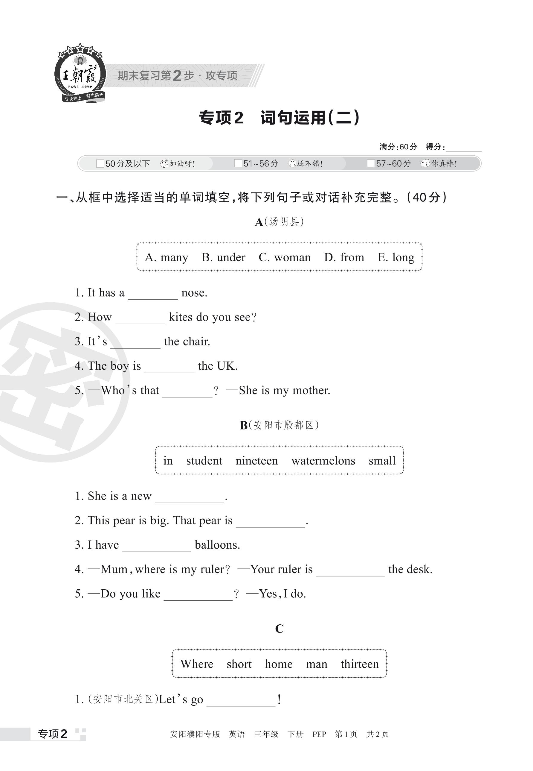 王朝霞期末专项卷——词句运用(二)三年级下册英语(PEP版)【2】