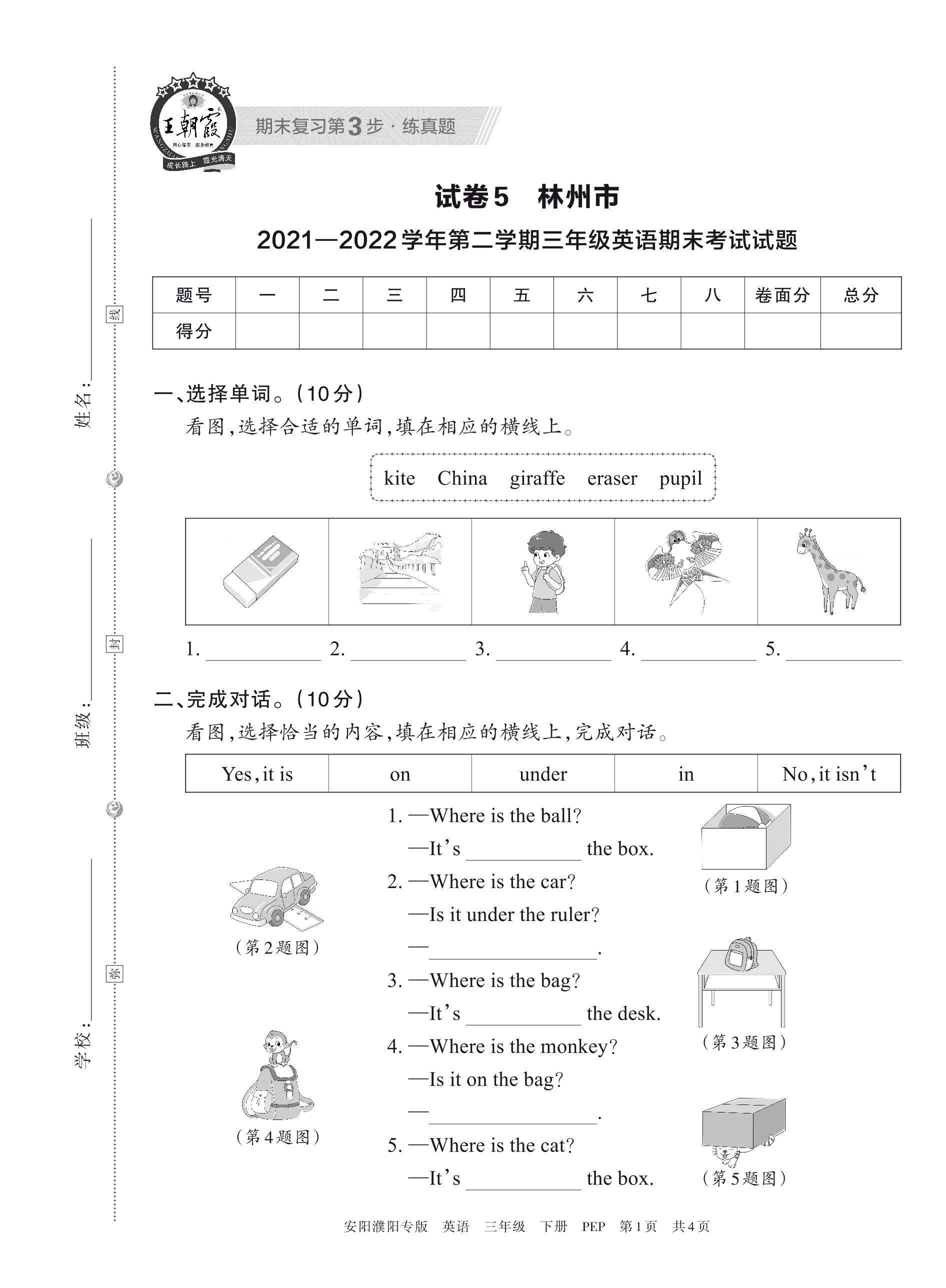 林州市2021—2022学年第二学期三年级英语期末考试试题(PEP版)【5】