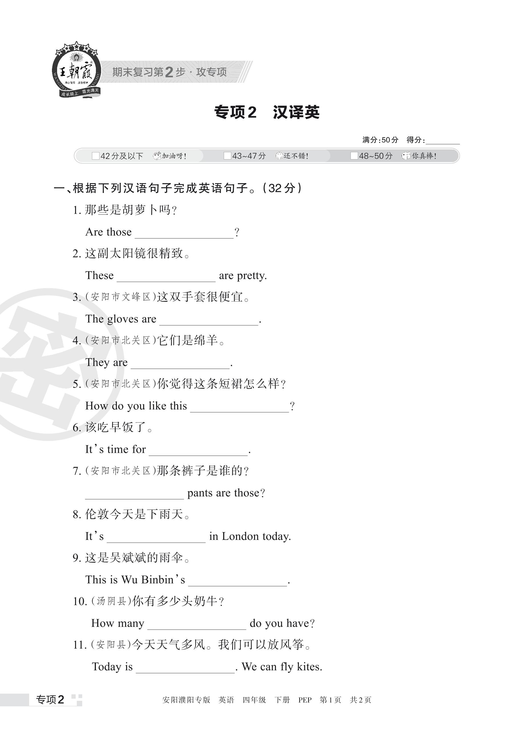 王朝霞期末专项卷——汉译英四年级下册英语(PEP版)_R230504143023096【2】