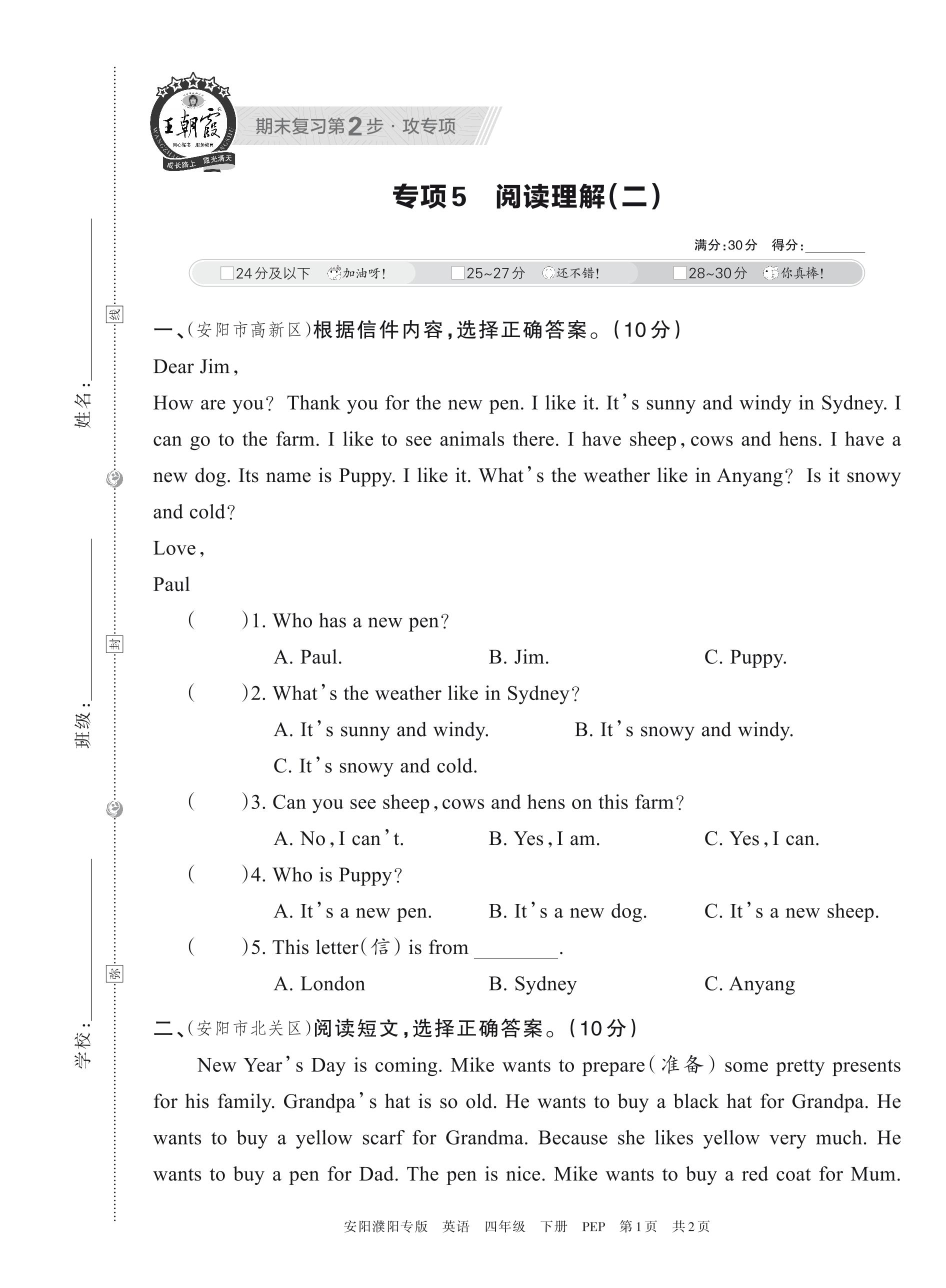 王朝霞期末专项卷——阅读理解(二)四年级下册英语(PEP版)_R230504143023942【5】