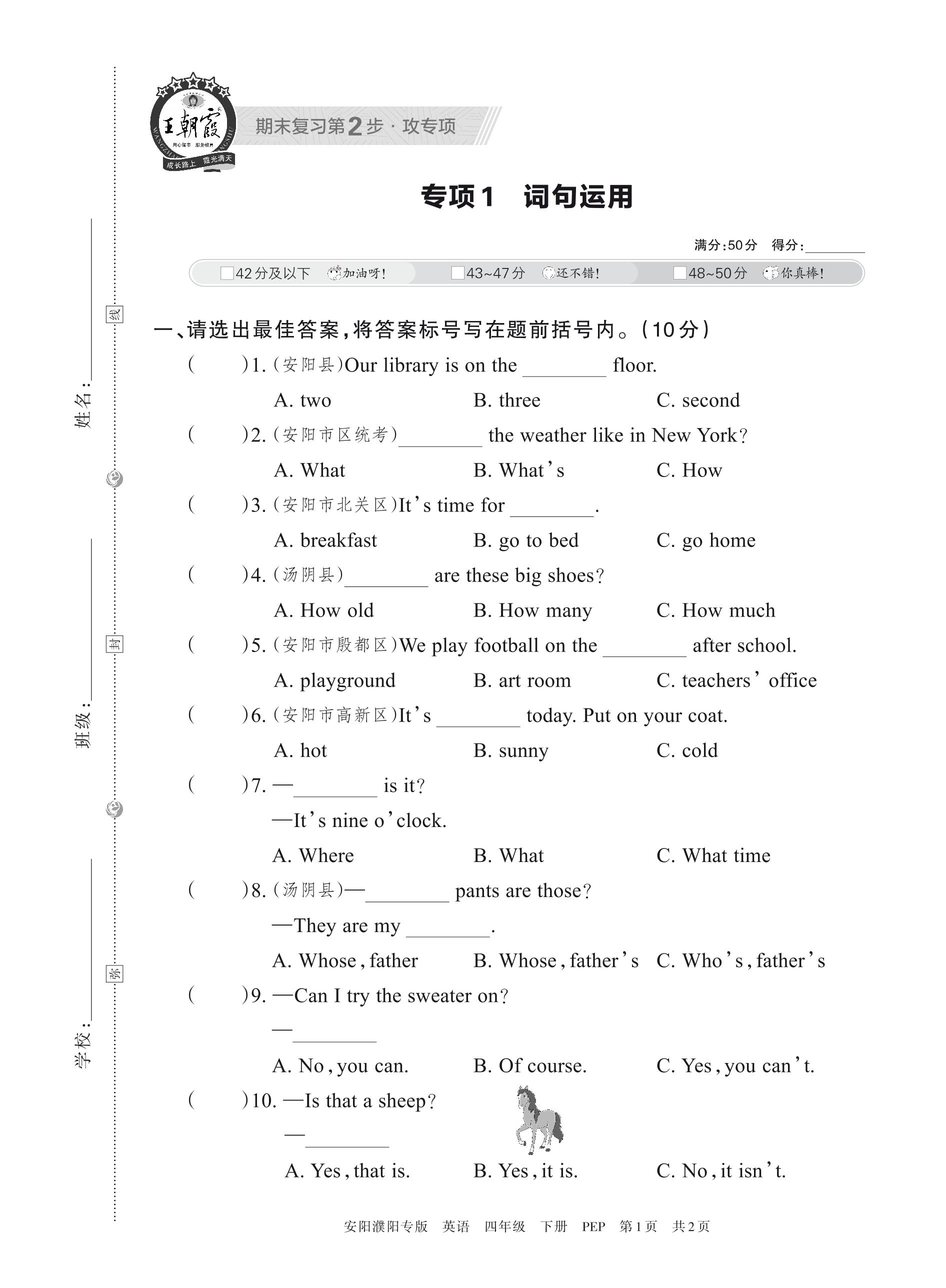 王朝霞期末专项卷——词句运用四年级下册英语(PEP版)【1】