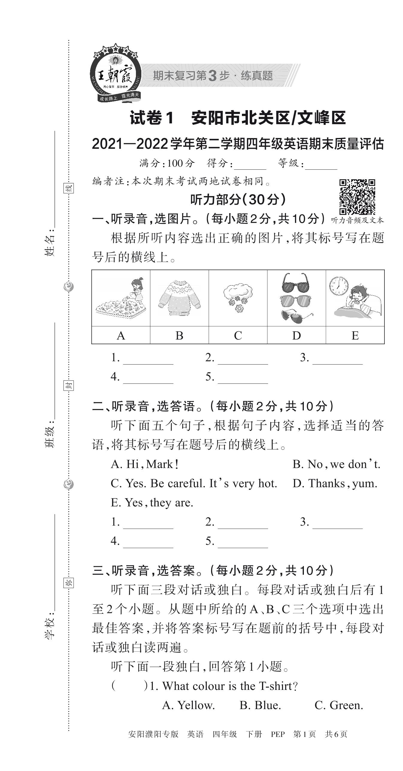 安阳市北关区、文峰区2021—2022学年第二学期四年级英语期末质量评估(PEP版)【1】