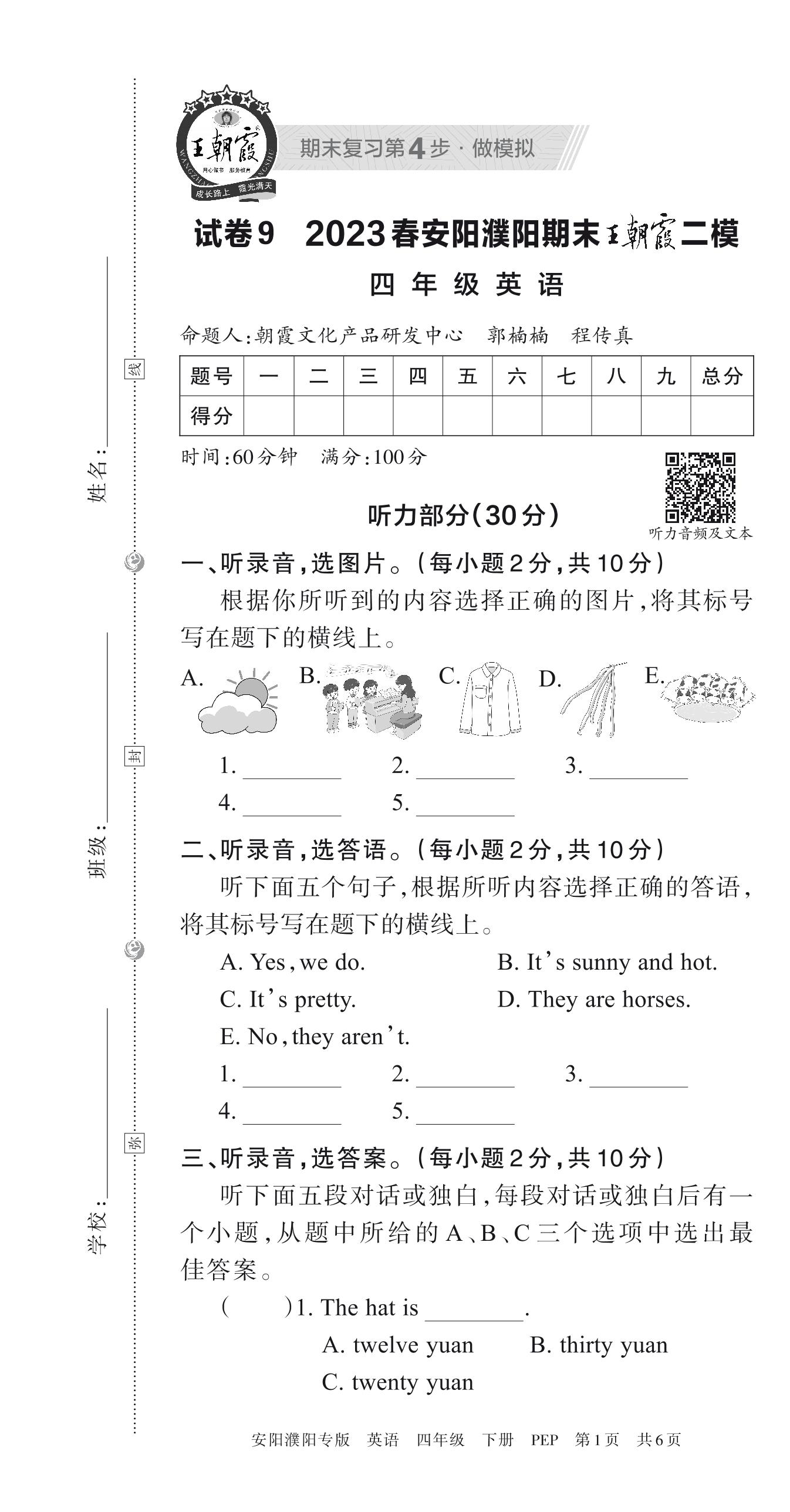 王朝霞期末模拟卷四年级下册英语(PEP版)_R230504143025617【9】