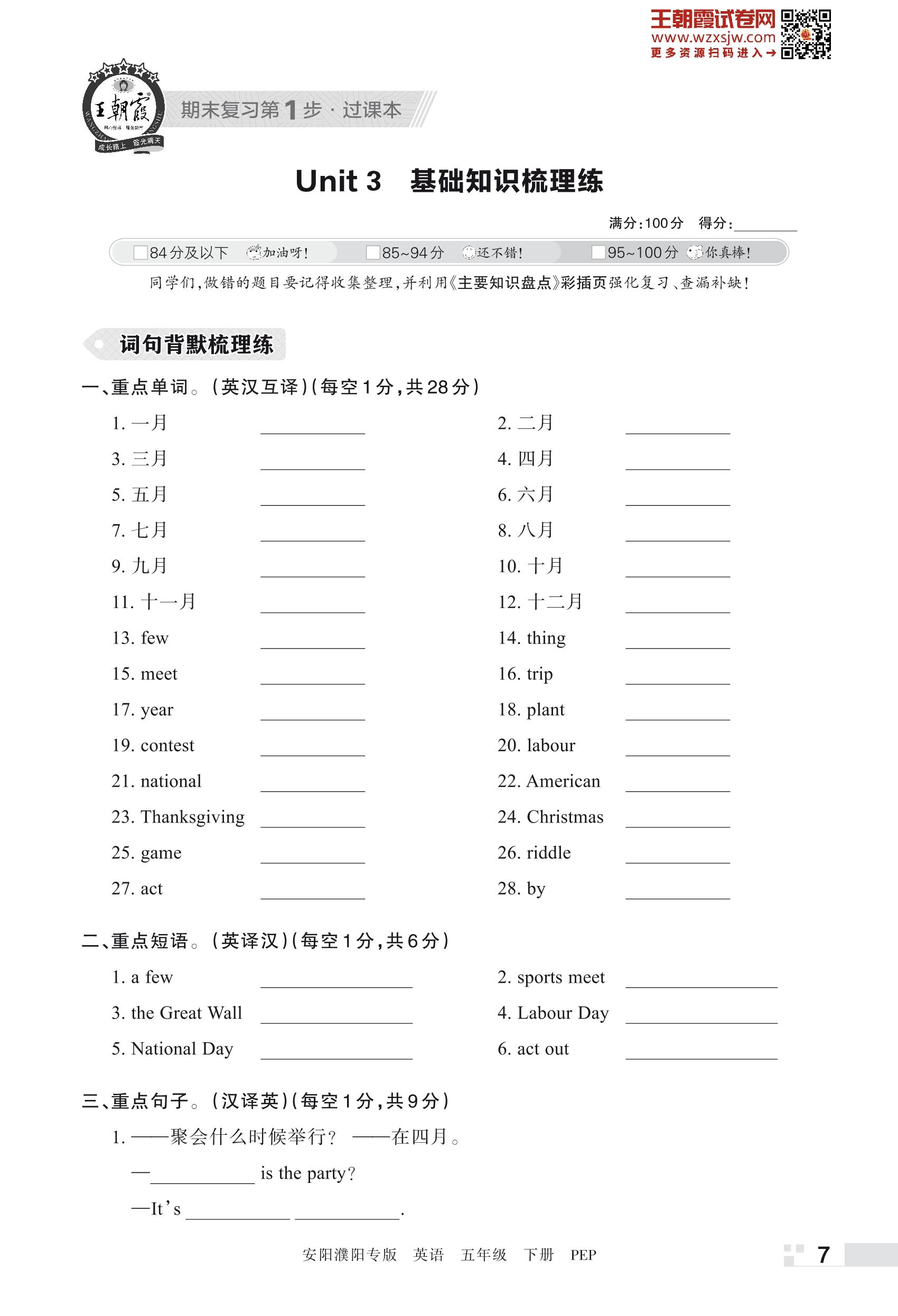 王朝霞期末过课本——Unit 3 基础知识梳理练五年级下册英语(PEP版)_R230504143800989