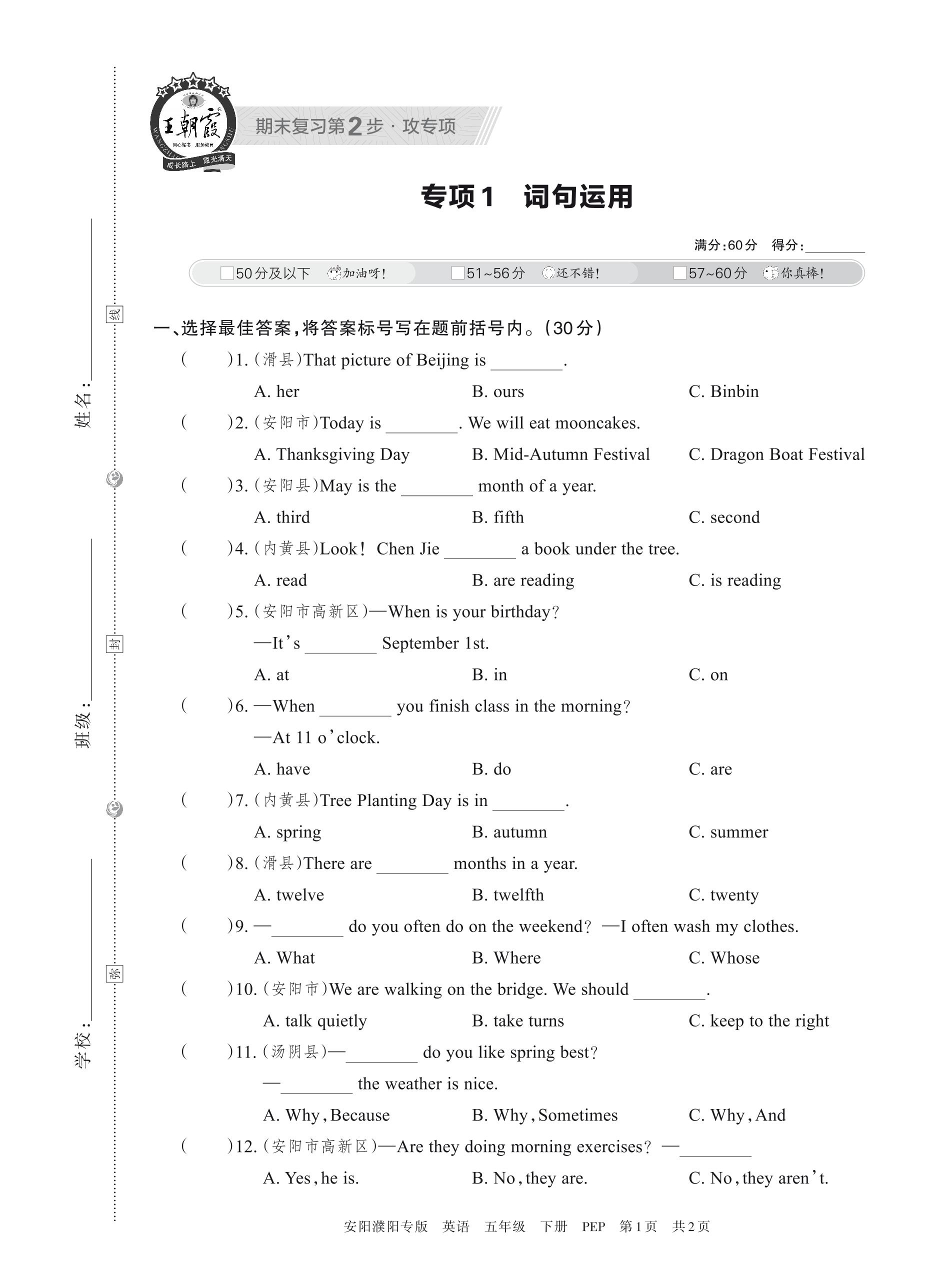 王朝霞期末专项卷——词句运用五年级下册英语(PEP版)【1】