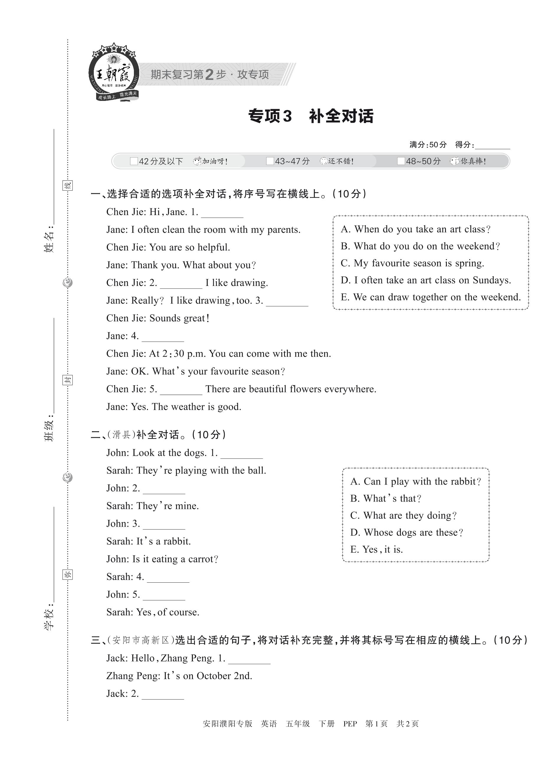 王朝霞期末专项卷——补全对话五年级下册英语(PEP版)_R230504143801398【3】