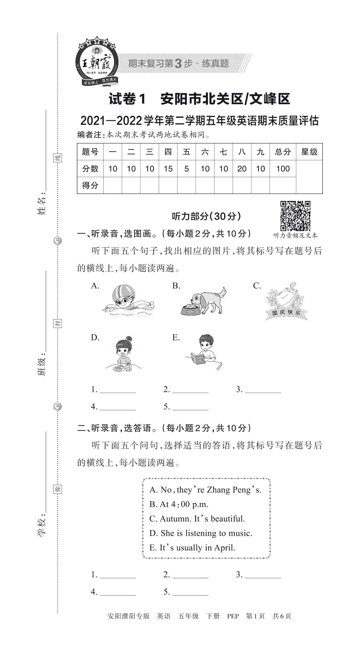 安阳市北关区、文峰区2021—2022学年第二学期五年级英语期末质量评估(PEP版)【1】