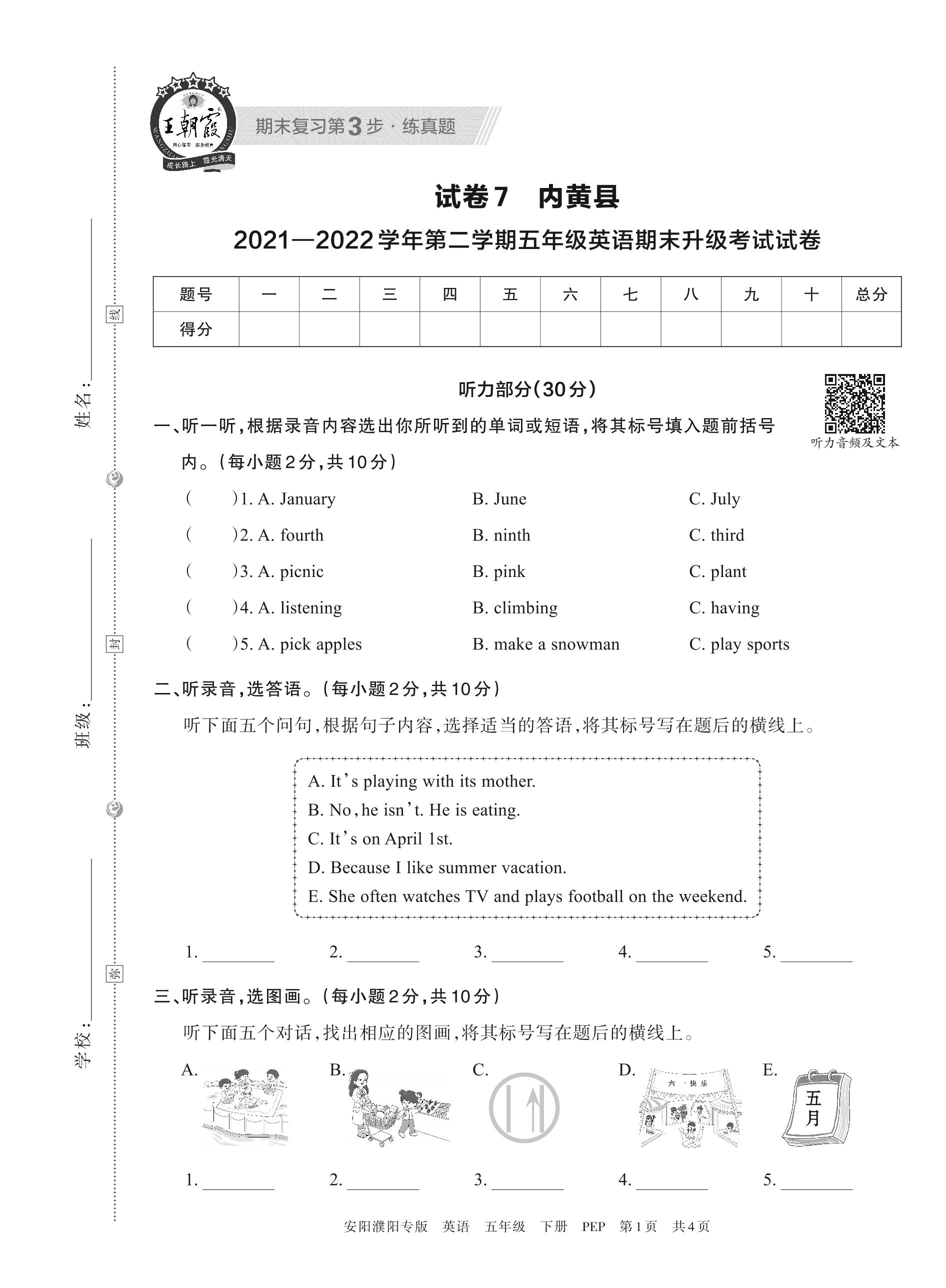 内黄县2021—2022学年第二学期五年级英语期末升级考试试卷(PEP版)【7】