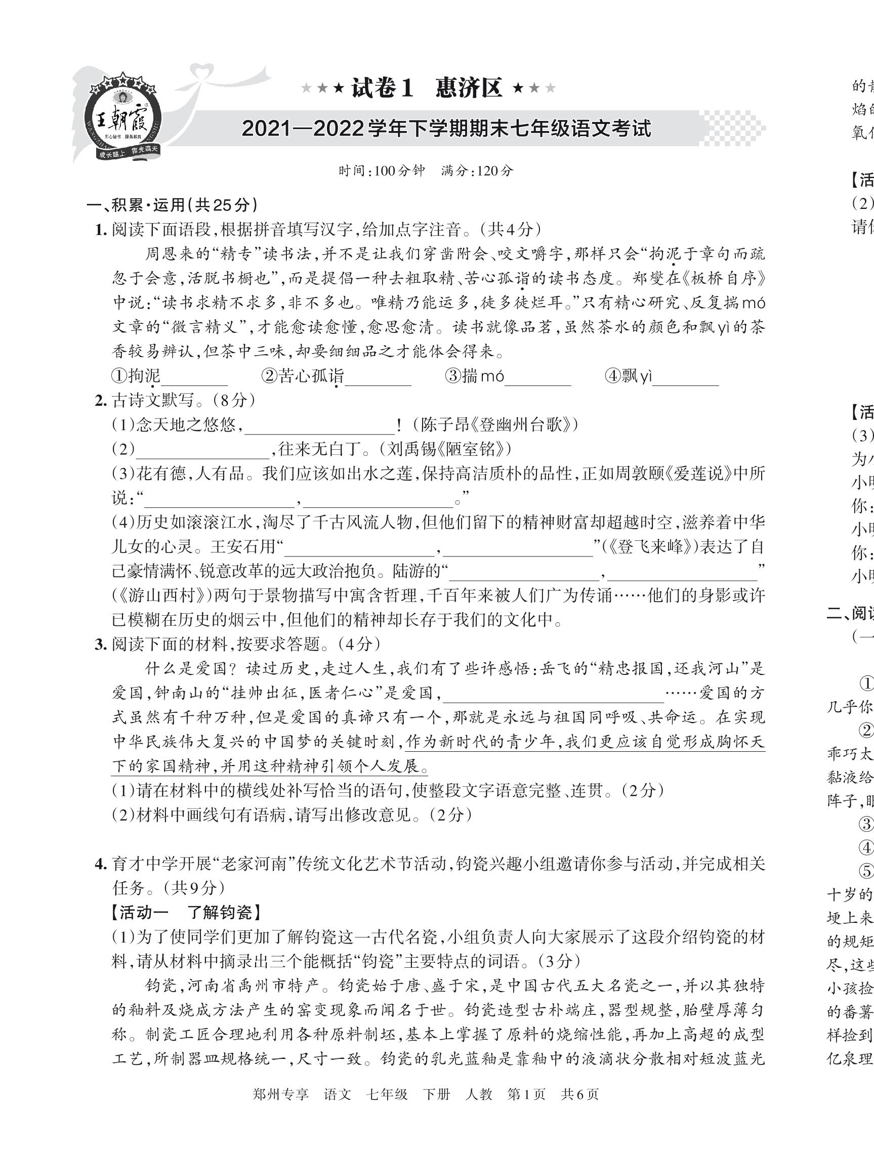 惠济区2021—2022学年下学期期末七年级语文考试【1】
