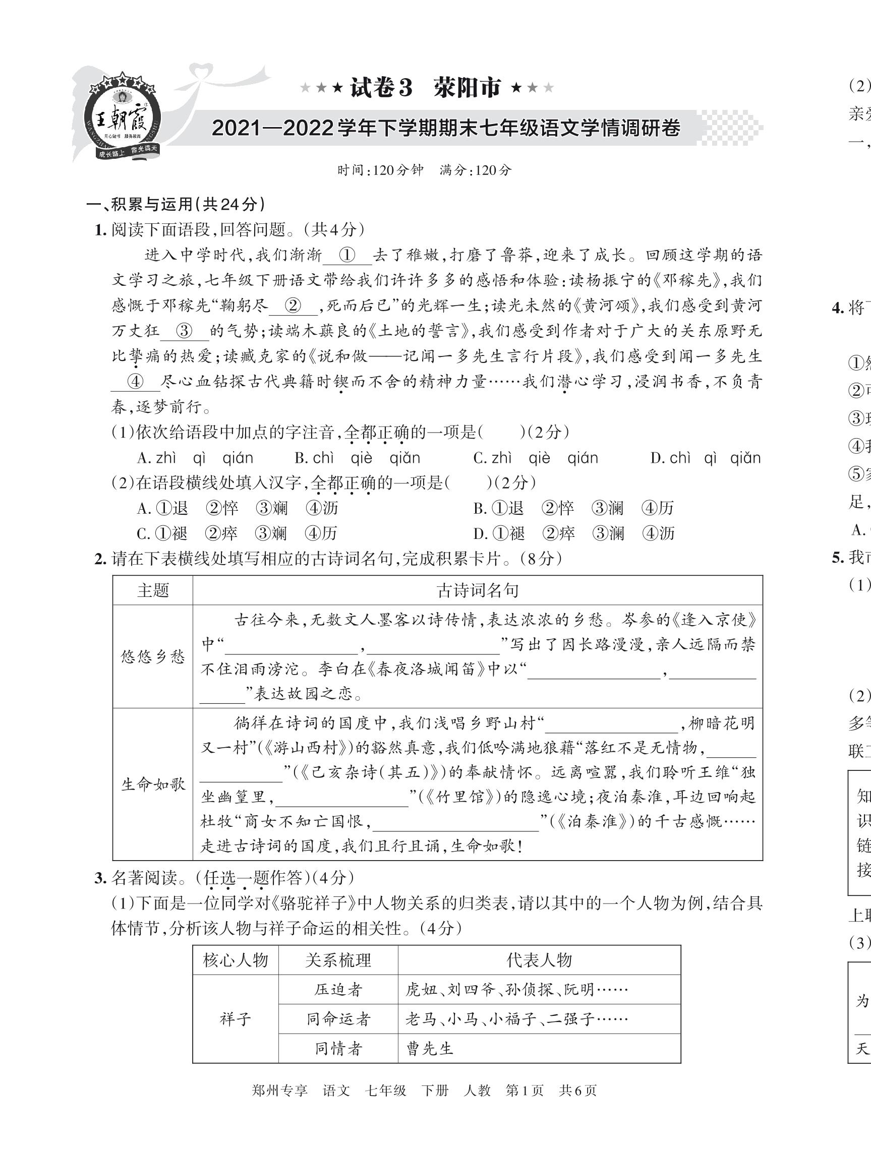 荥阳市2021—2022学年下学期期末七年级语文学情调研卷【3】