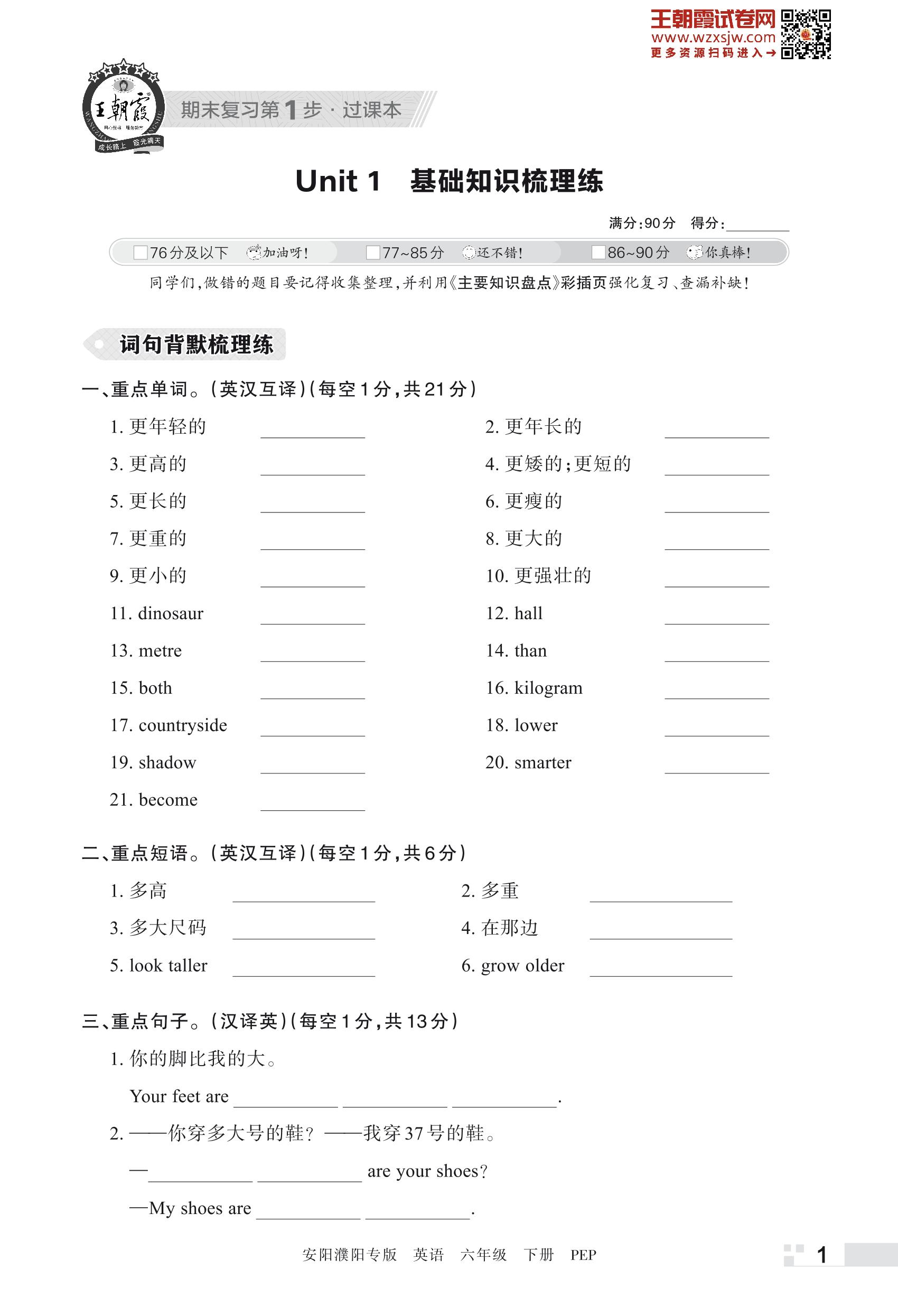 王朝霞期末过课本——Unit 1 基础知识梳理练六年级下册英语(PEP版)_R230504144410858