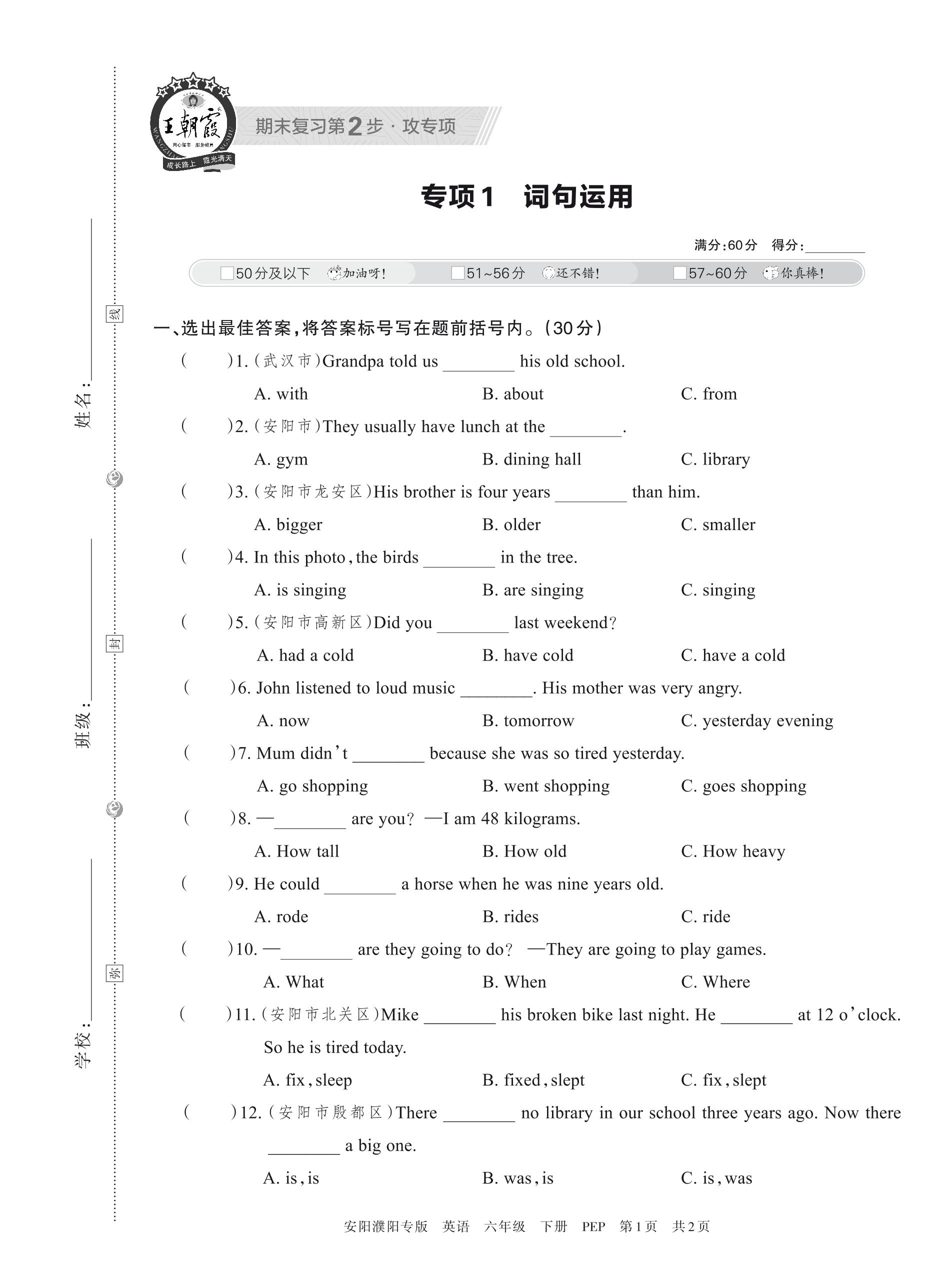 王朝霞期末专项卷——词句运用六年级下册英语(PEP版)【1】