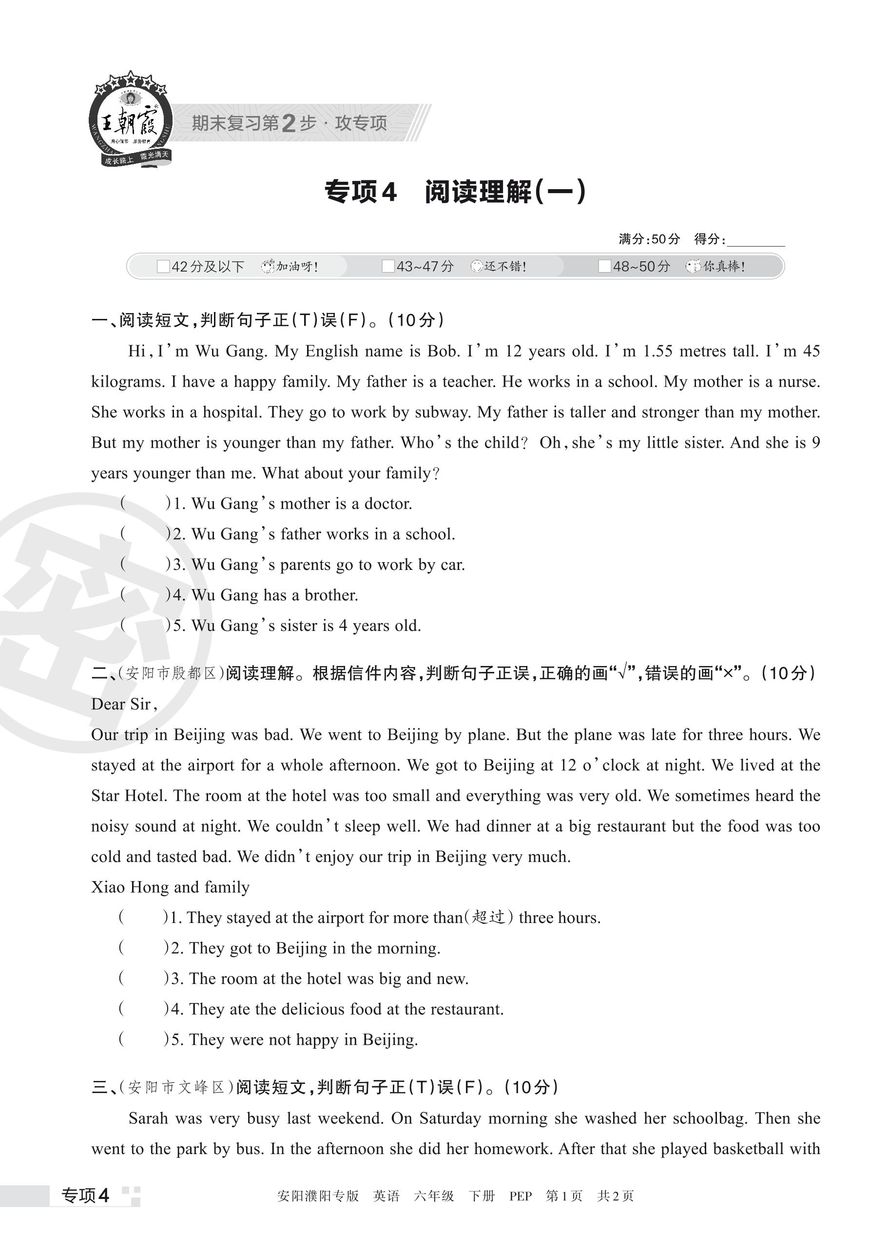 王朝霞期末专项卷——阅读理解(一)六年级下册英语(PEP版)_R230504144411426【4】