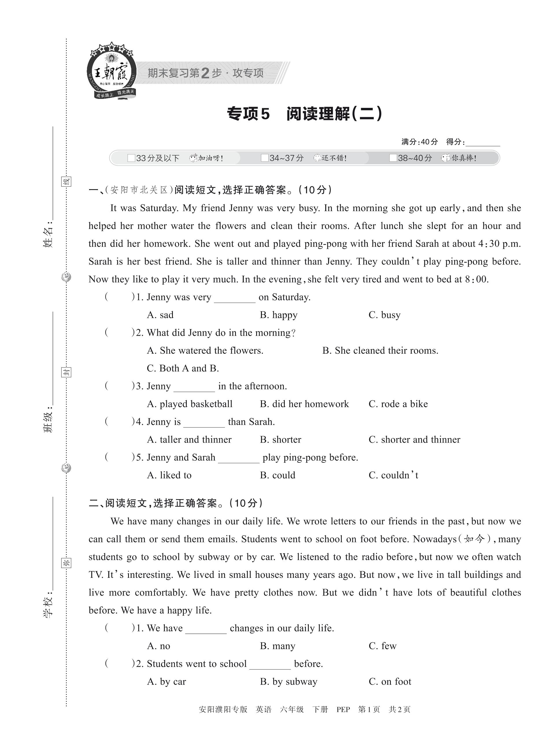 王朝霞期末专项卷——阅读理解(二)六年级下册英语(PEP版)_R230504144411537【5】
