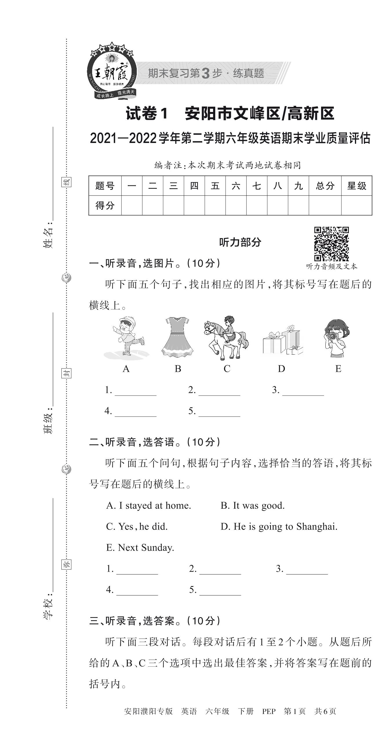 安阳市文峰区、高新区2021—2022学年第二学期六年级英语期末学业质量评估(PEP版)【1】