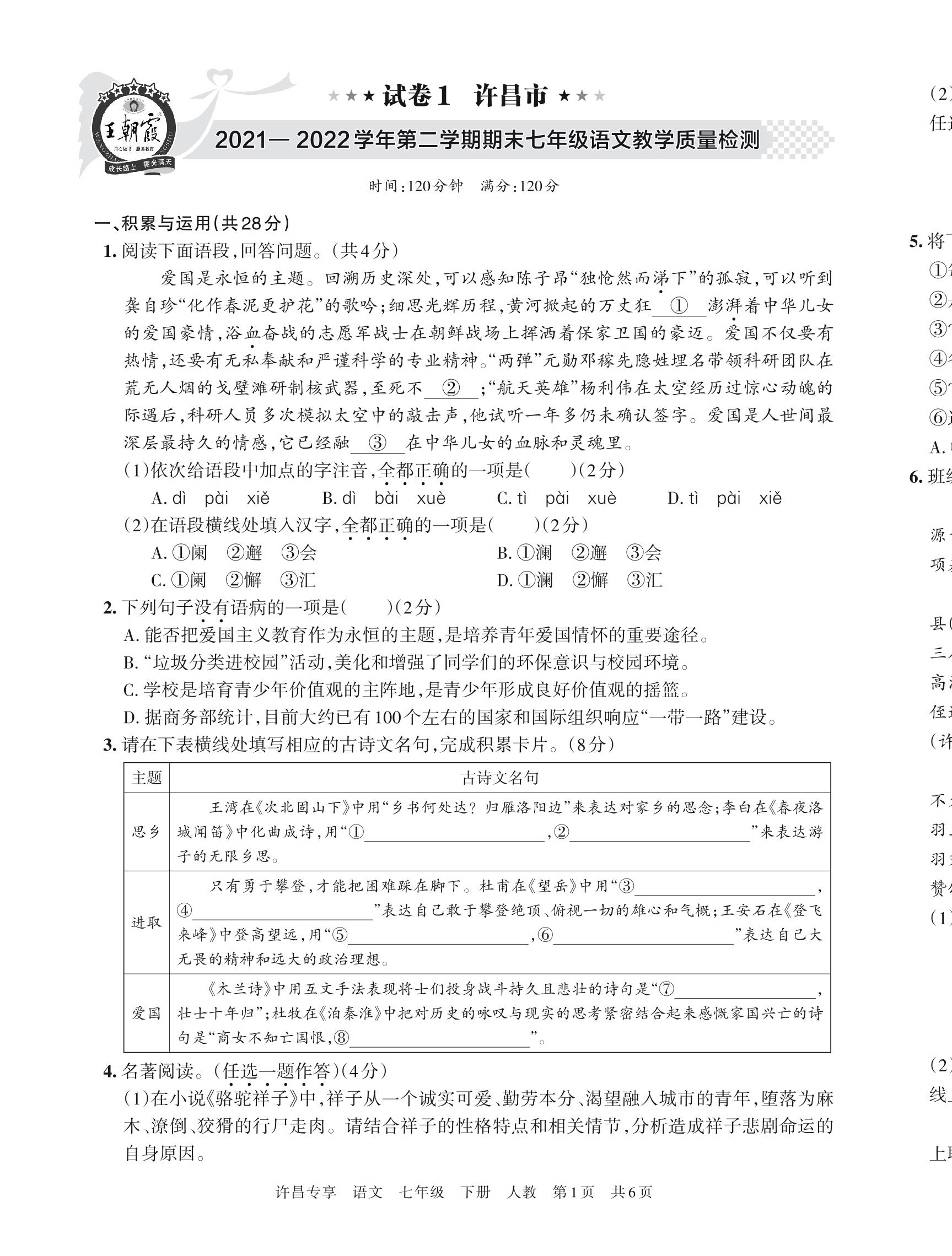 许昌市2021— 2022学年第二学期期末七年级语文教学质量检测(人教版)【1】