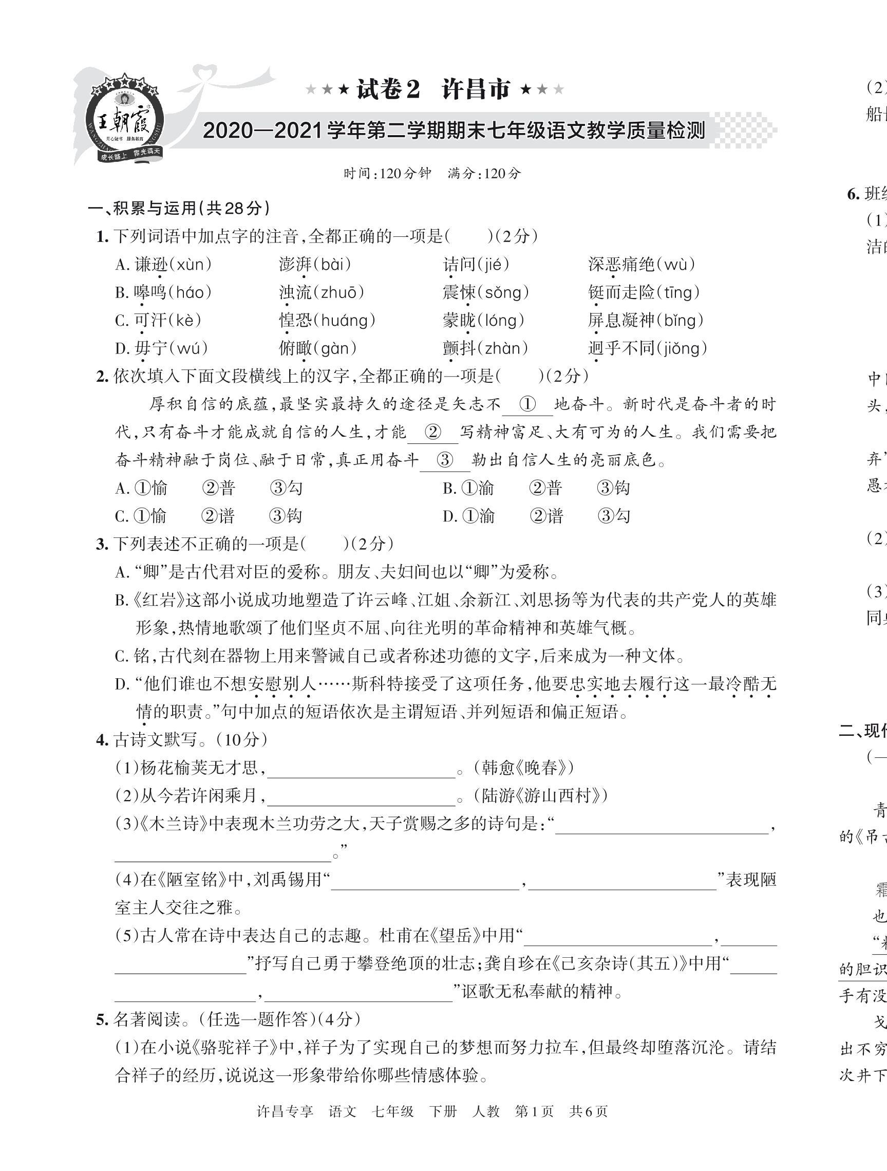 许昌市2020—2021学年第二学期期末七年级语文教学质量检测(人教版)【2】