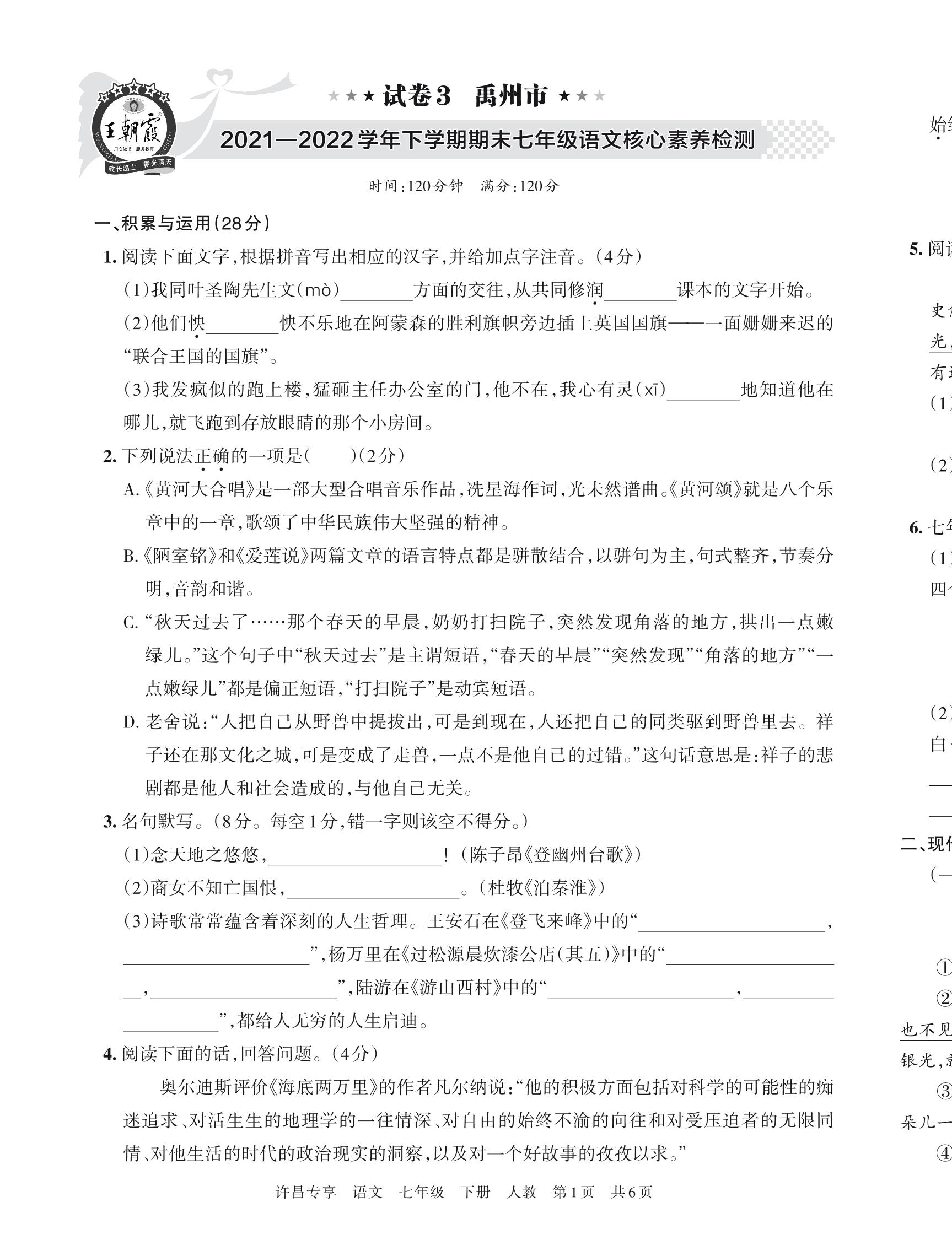 禹州市2021—2022学年下学期期末七年级语文核心素养检测(人教版)【3】