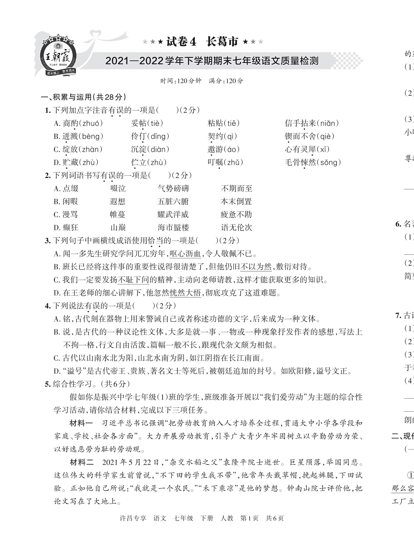长葛市2021—2022学年下学期期末七年级语文质量检测(人教版)【4】