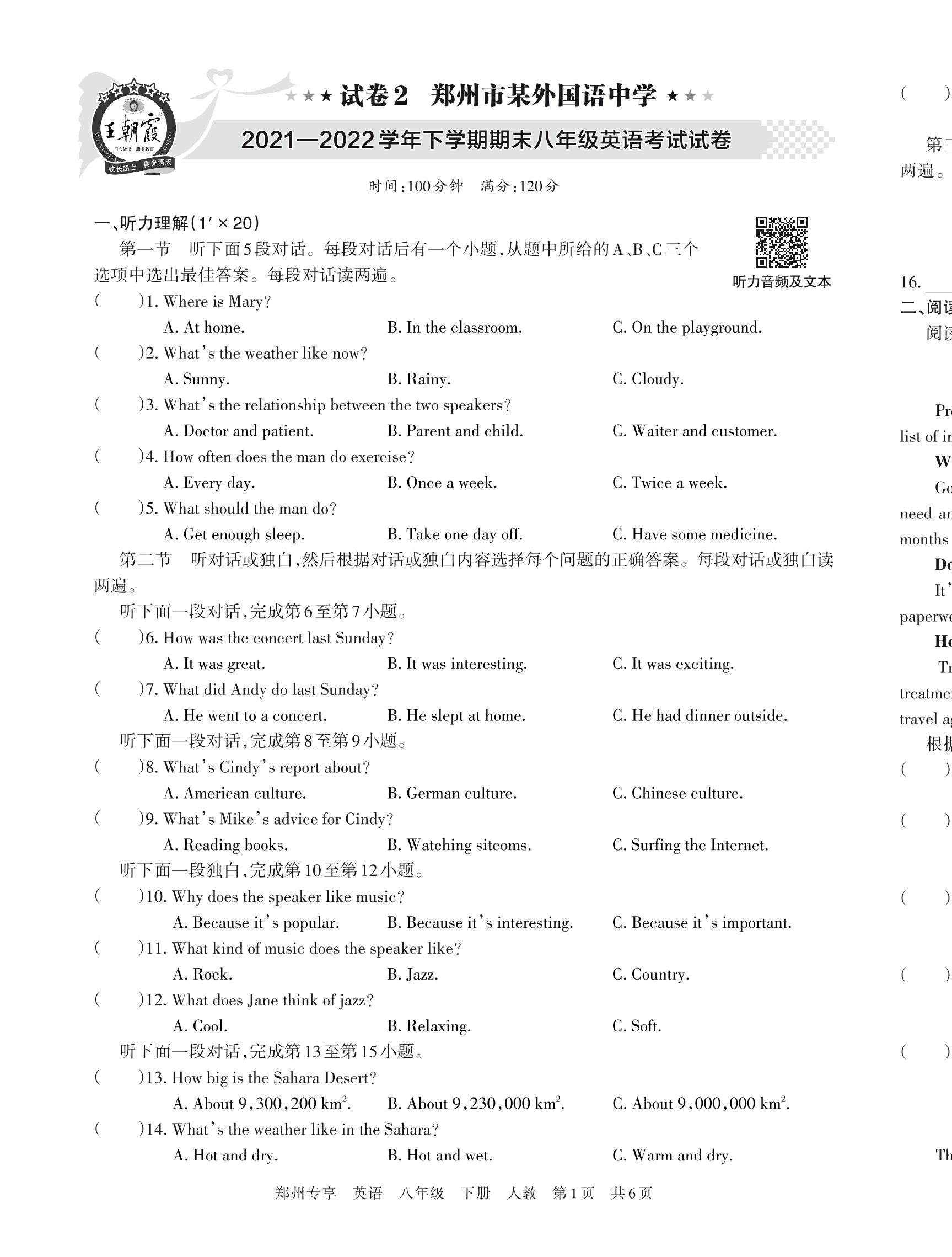 郑州市某外国语中学2021—2022学年下学期期末八年级英语考试试卷【2】