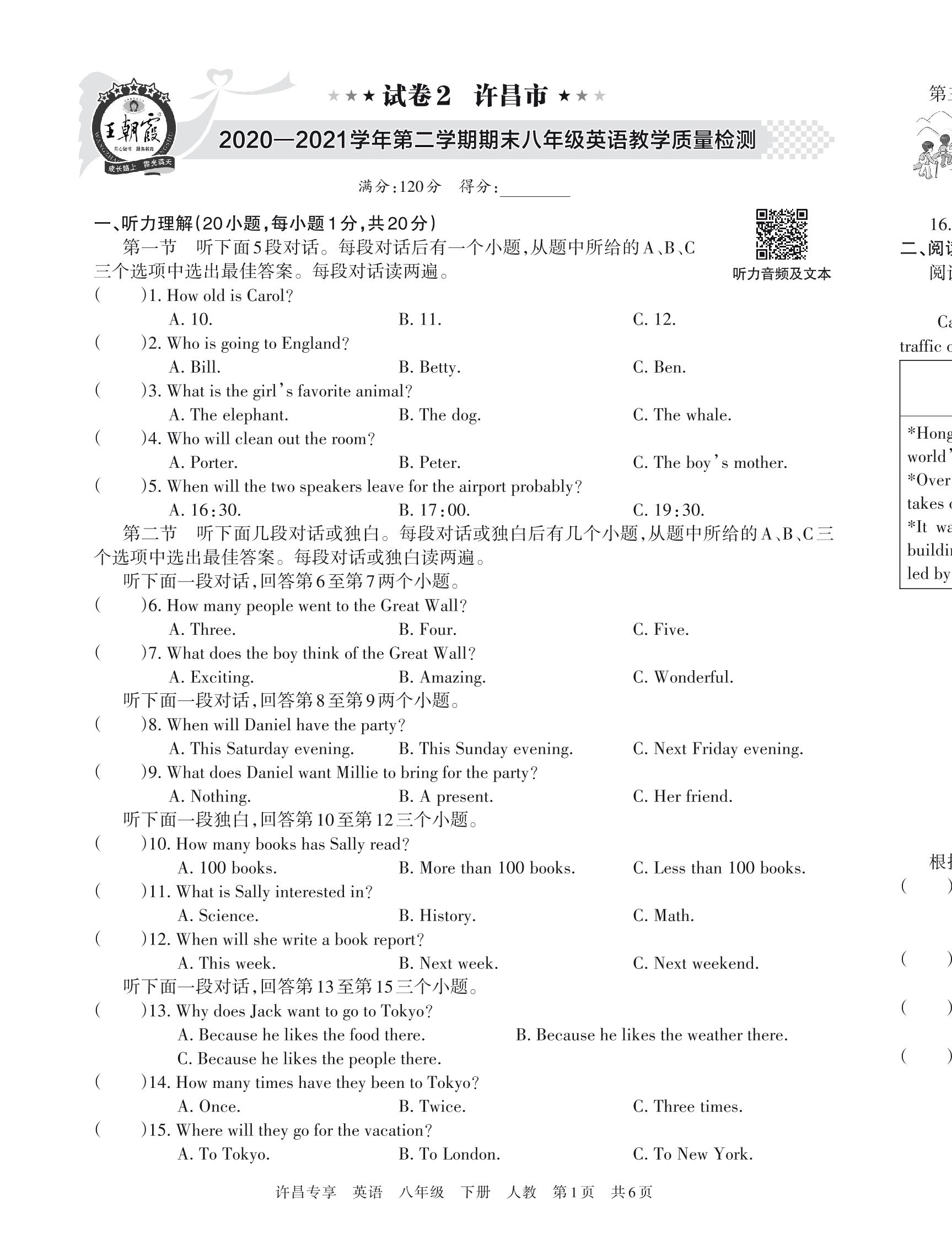 许昌市2020—2021学年第二学期期末八年级英语教学质量检测(人教版)【2】